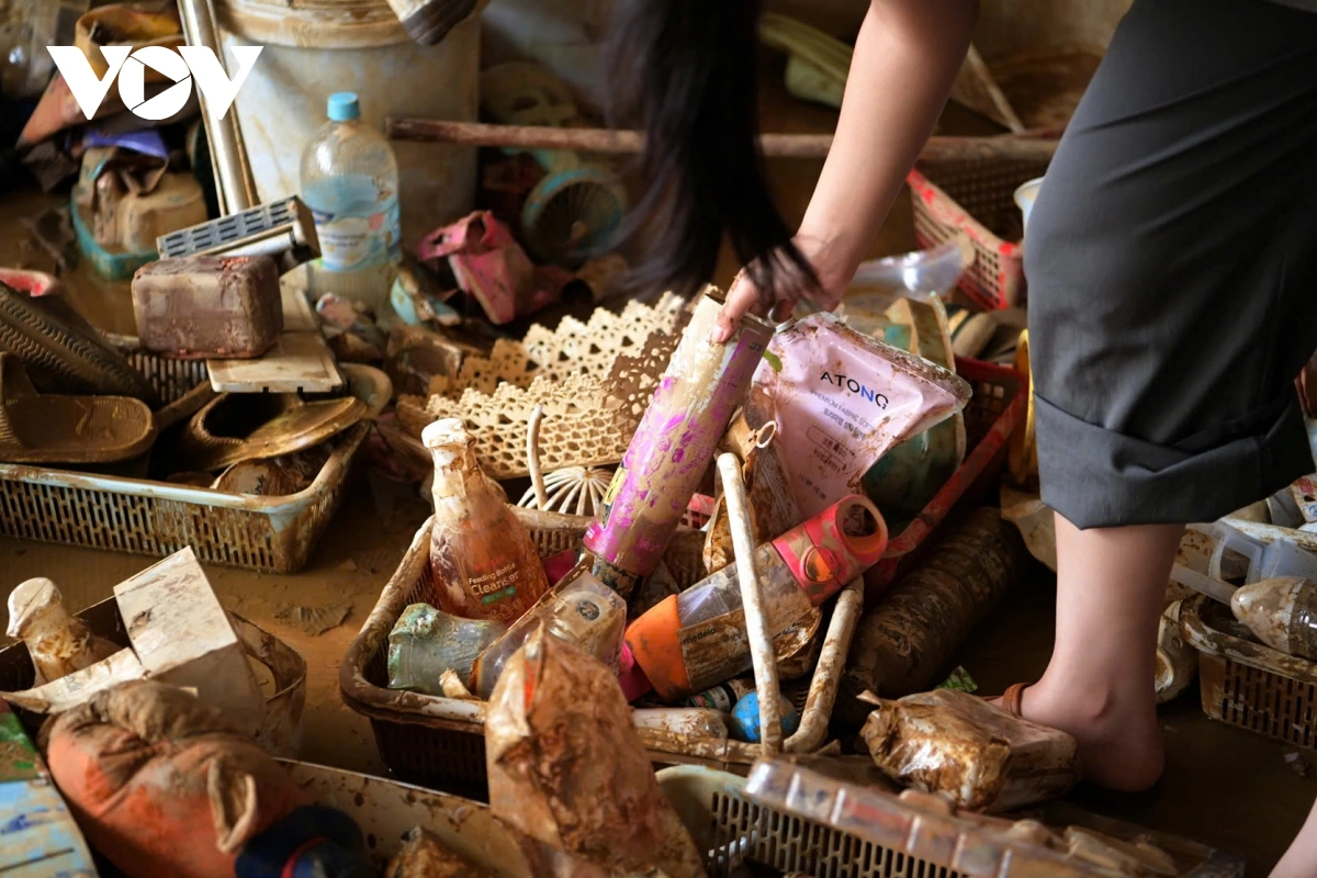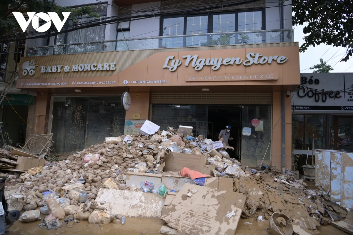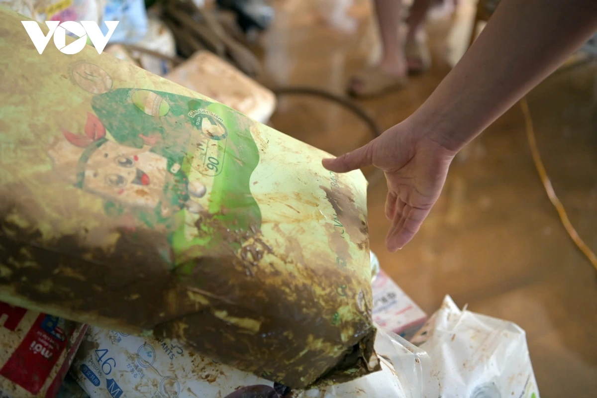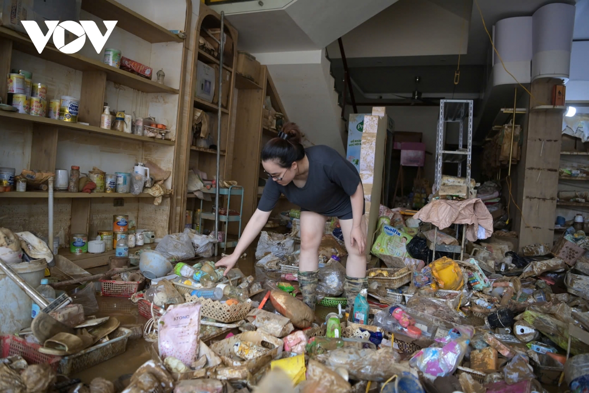 VOV.VN - Đứng giữa cửa hàng đồ sữa, bỉm và đồ trẻ em lớn nhất nhì Thái Nguyên ngập trong bùn đất sau khi lũ rút, chị Nguyễn Ly chủ cửa hàng bật khóc nức nở.
