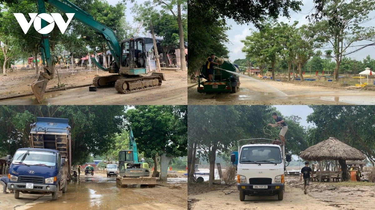Chủ khu du lịch bãi đá sông Hồng cho biết công tác dọn dẹp đã diễn ra ngay sau khi nước rút. Ban đầu, công nhân tự nạo vét bùn. Song, do lượng bùn quá nhiều, ông phải huy động xe cẩu, xe thùng, xe phun nước để đẩy nhanh quá trình làm sạch