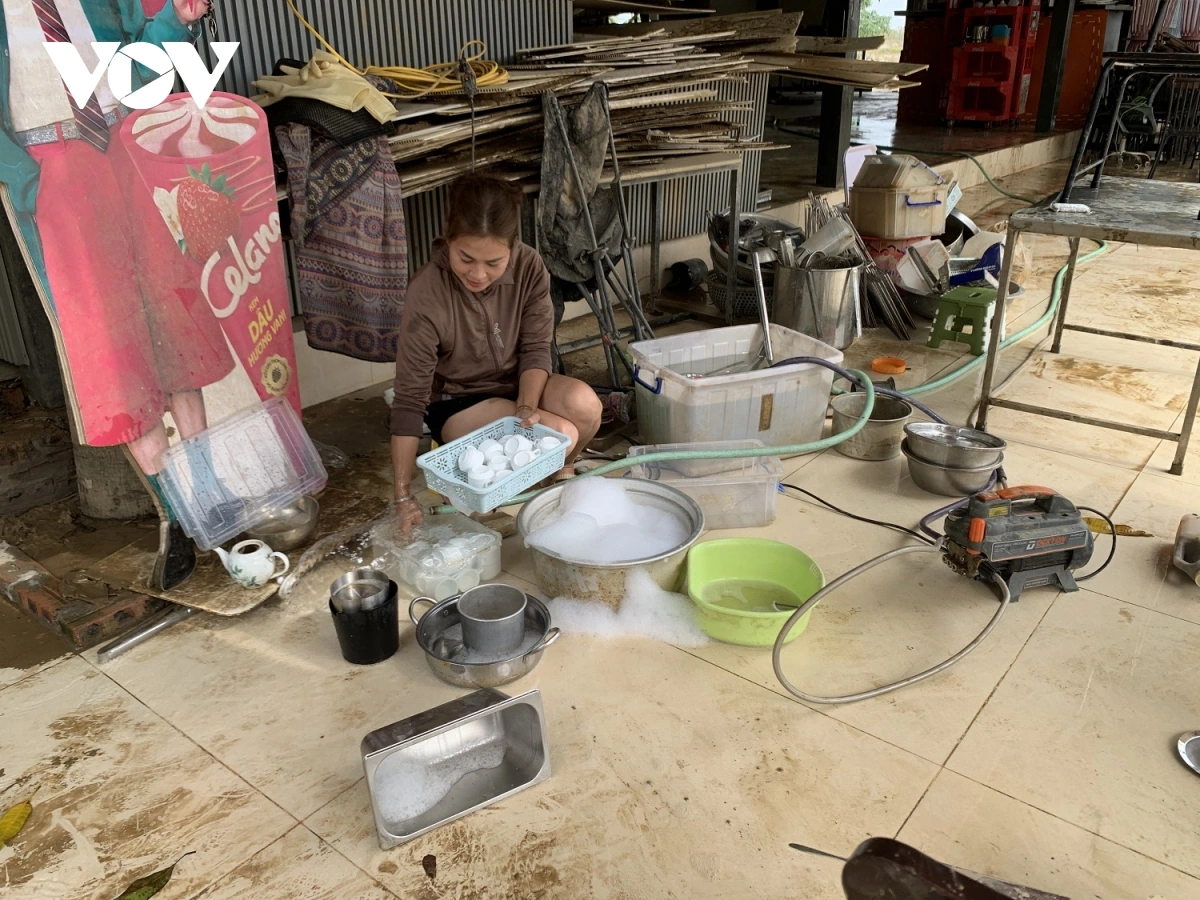 Chị Trịnh Thị Thúy Hồng - Chủ quán ăn tại khu du lịch Bãi đá sông Hồng chia sẻ: “Nước dâng ngập tới mái nhà. Sau khi nước rút, tôi đã tiến hành làm sạch quán từ 4 ngày nay. Dù không có thiệt hại quá lớn, quán ăn cũng cần được dọn dẹp kỹ lưỡng. Để hoạt động trở lại bình thường, có lẽ phải tới cuối tháng 10".