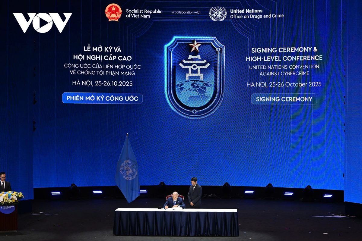 Ngay sau phiên khai mạc, Chủ tịch nước Lương Cường, Tổng thư ký Liên Hợp Quốc Antonio Guterres và các đại biểu đã chứng kiến đại diện các nước lên ký Công ước của Liên Hợp Quốc về Chống tội phạm mạng.