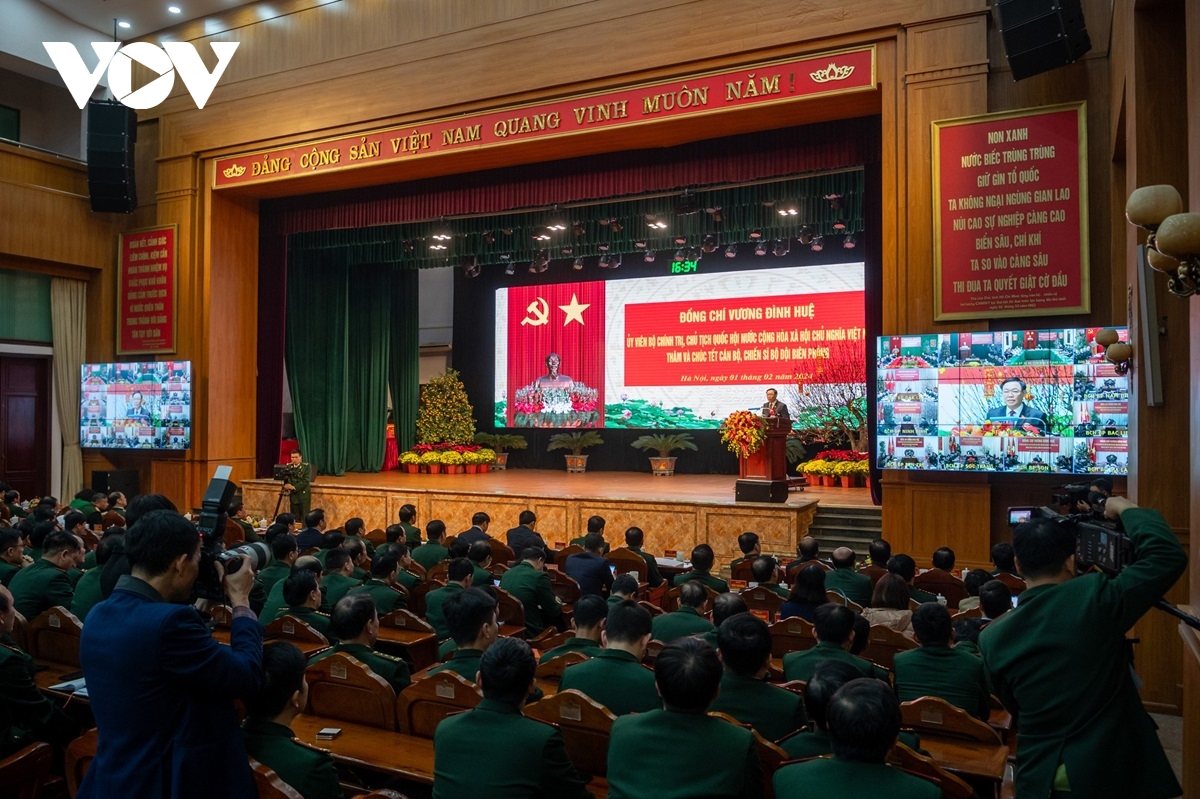 VOV.VN - Nhân dịp Tết Nguyên đán Giáp Thìn, Kỷ niệm 94 năm ngày thành lập Đảng (3/2/1930-3/2/2024), kỷ niệm 65 năm Ngày truyền thống Bộ đội Biên phòng (3/3/1959-03/3/2024), 35 năm Ngày Biên phòng toàn dân (3/3/1989- 3/3/2024), chiều nay, tại Bộ Tư lệnh Bộ đội Biên phòng, Chủ tịch Quốc hội Vương Đình Huệ đã thăm và chúc Tết cán bộ, chiến sĩ Bộ đội Biên phòng.