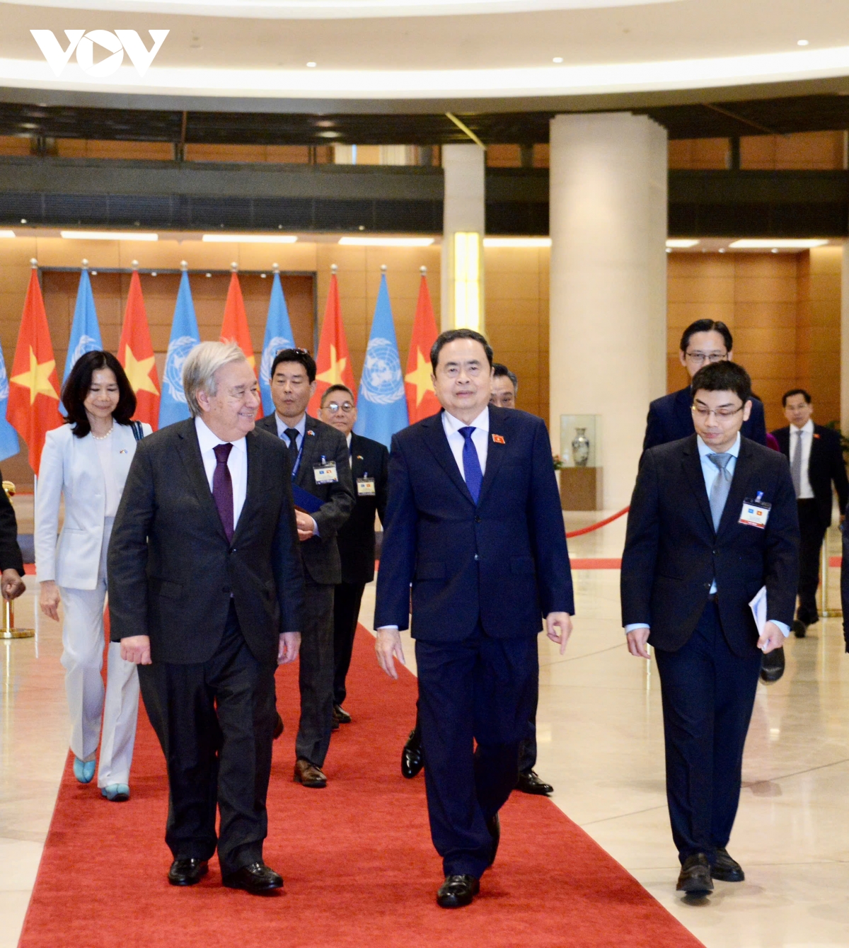 Ngưỡng mộ trước những thành tựu phát triển kinh tế - xã hội của Việt Nam, Tổng Thư ký đặc biệt chúc mừng những kết quả đạt được trong công cuộc cải cách nhanh chóng, sâu sắc vừa qua của Việt Nam, cho rằng Việt Nam là một hình mẫu thành công trong thúc đẩy phát triển bền vững, thực hiện cam kết về chuyển đổi xanh, chuyển đổi số, đổi mới, sáng tạo và cải cách mạnh mẽ để phát triển nhanh, mạnh, bền vững và phục vụ nhân dân tốt hơn, là những kinh nghiệm tốt có thể chia sẻ cho các nước và Liên Hợp Quốc tham khảo. Tổng Thư ký ấn tượng về những nỗ lực và đóng góp của Quốc hội Việt Nam trong tiến trình này và hoạt động khẩn trương, tích cực của kỳ họp Quốc hội hiện nay.