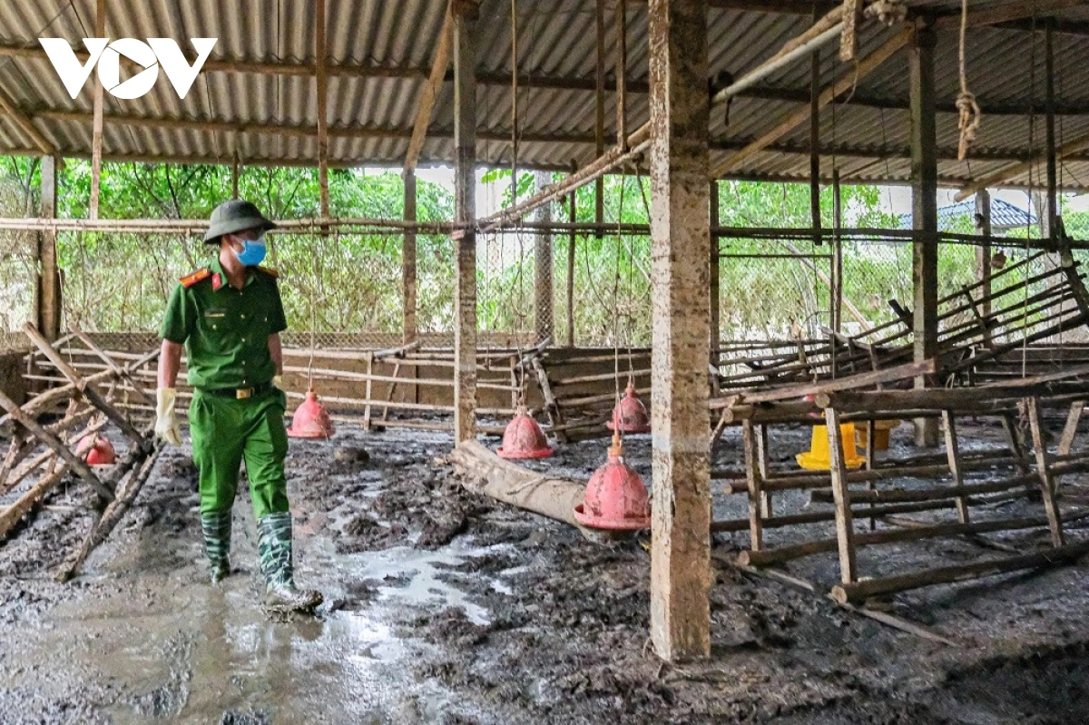 Sơ bộ đến ngày 14/10, lực lượng công an đã dọn dẹp, thu gom hàng chục nghìn con gà chết, 300-400 heo chết, sau đó đóng bao, đưa đi chôn lấp, rắc vôi bột, đảm bảo không lây lan dịch bệnh, ô nhiễm môi trường.