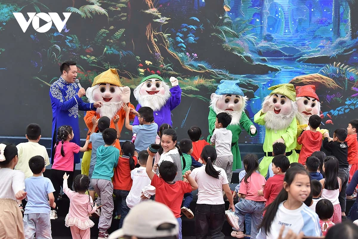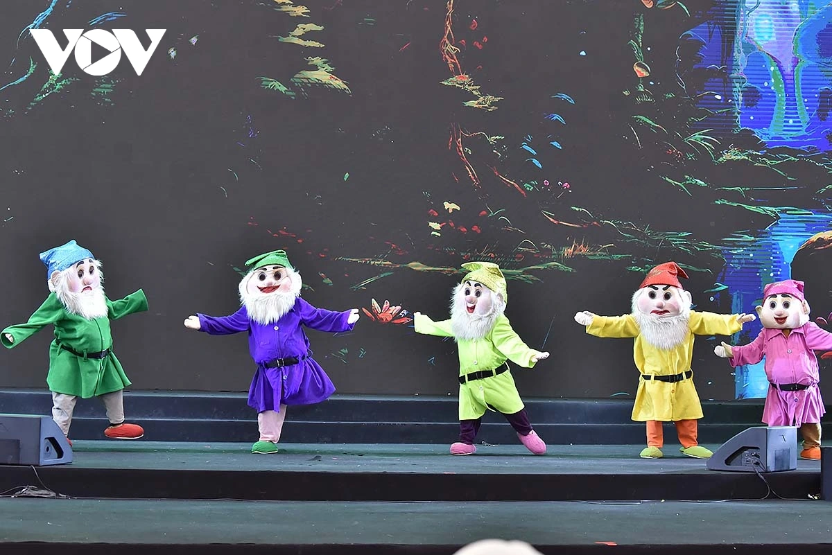 Các khán giả nhỉ thích thú giao lưu cùng 7 chú lùn trên sân khấu trung tâm Hội chợ mùa thu lần thứ nhất - năm 2025.