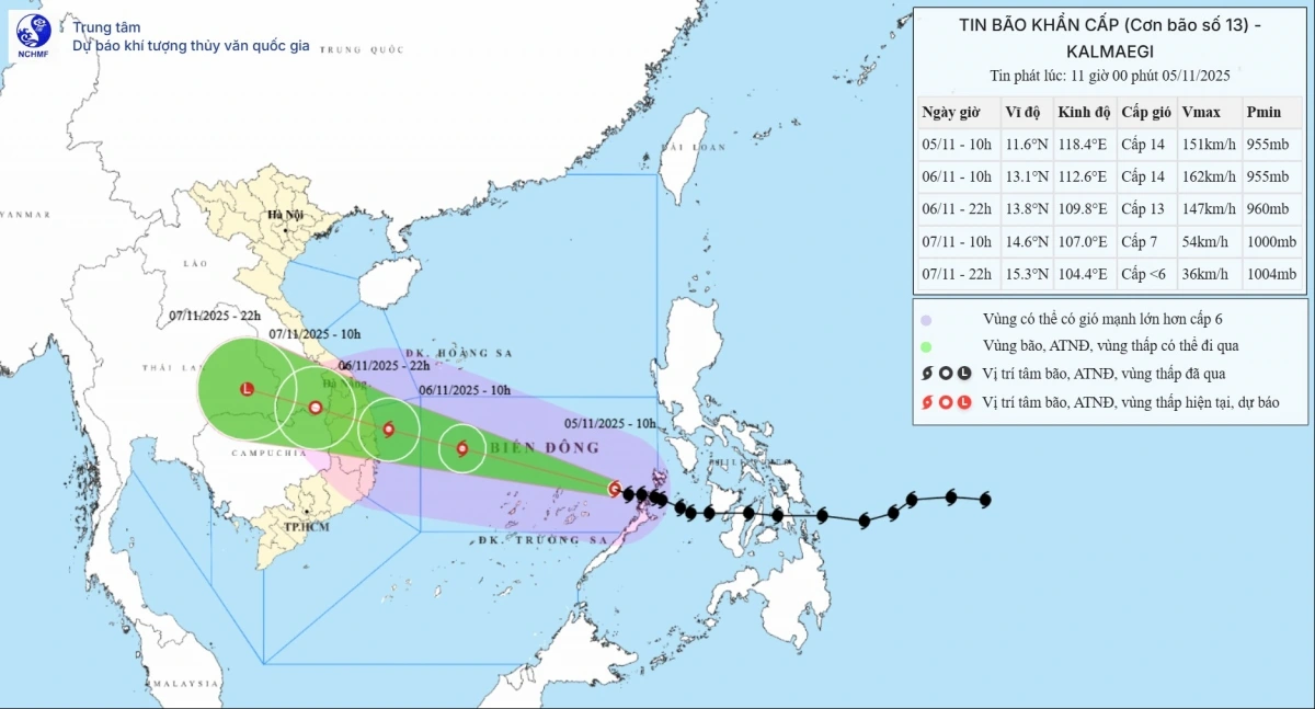 VOV.VN - Cơn bão số 13 (Kalmaegi) đang tiến gần Biển Đông với sức gió mạnh cấp 13-14, giật cấp 17, dự báo ảnh hưởng trực tiếp đến các tỉnh ven biển từ Quảng Trị đến Đắk Lắk. Bão kết hợp với thủy triều cao và mưa lớn có thể gây ngập úng, sạt lở bờ biển, gián đoạn giao thông và nguy cơ dông lốc.