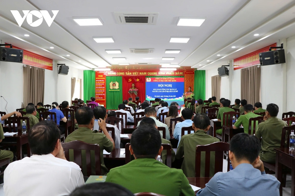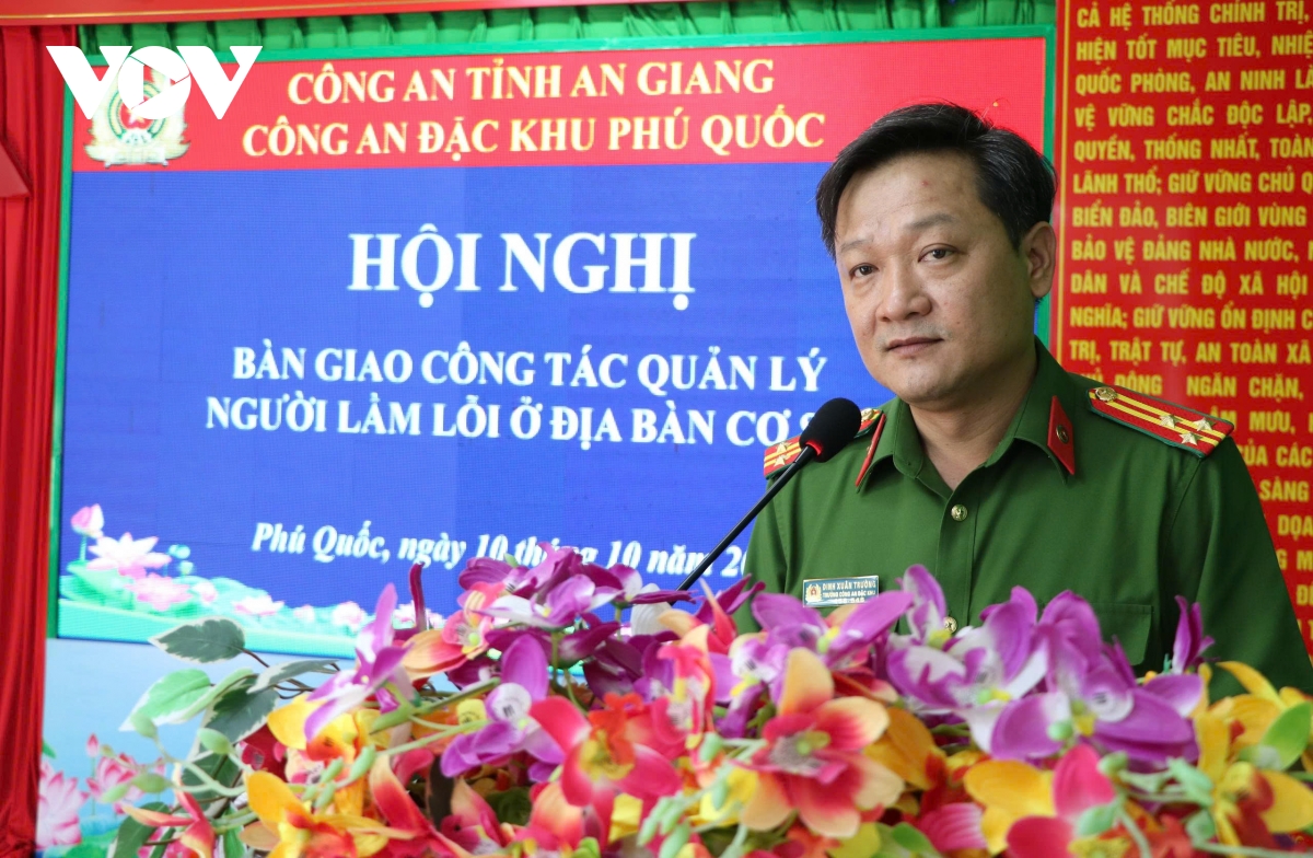 VOV.VN - Chiều 10/10, Công an đặc khu Phú Quốc (tỉnh An Giang) tổ chức Hội nghị bàn giao công tác quản lý đối tượng lầm lỗi ở địa bàn cơ sở. Thượng tá Đinh Xuân Trường, Trưởng Công an đặc khu Phú Quốc dự và chủ trì Hội nghị.