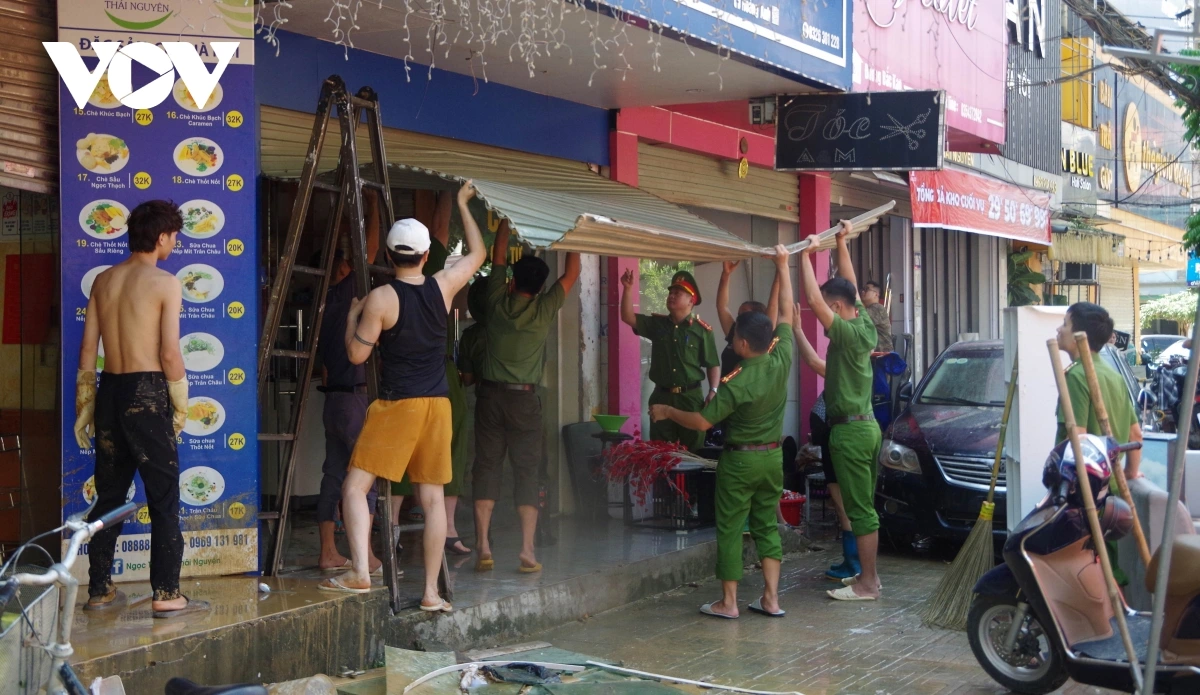 Để kịp thời hỗ trợ nhân dân, các cơ quan, đơn vị và trường học vệ sinh môi trường sau đợt lũ và sớm trở lại nhịp sinh hoạt bình thường, Giám đốc Công an tỉnh Thái Nguyên đã nhanh chóng huy động cán bộ, chiến sĩ từ các đơn vị trực thuộc, cùng với công an các xã, phường tham gia nỗ lực khắc phục hậu quả mưa lũ. Lực lượng này đã phối hợp với nhân dân, các ngành và đoàn thể tổ chức quét dọn, lau rửa nhà cửa, các tuyến đường và thu gom lại đồ dùng và tài sản. Phương châm hành động là "nước rút đến đâu vệ sinh đến đó".