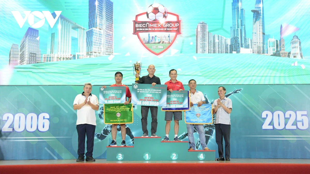 VOV.VN - Chiều 18/10, trên sân vận động Thành phố mới Bình Dương (phường Bình Dương, TP.HCM) diễn ra trận chung kết Giải bóng đá cộng đồng Becamex Group Cup lần thứ 18. Đội Công an TP.HCM đã giành chiến thắng áp đảo 9-2 trước đội Nhất Trung và lần đầu tiên chạm tay vào chiếc cúp vô địch danh giá.
