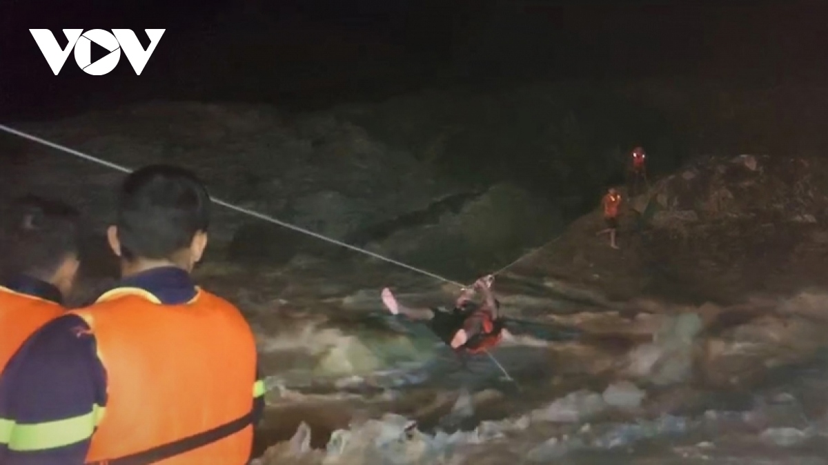 Lực lượng cứu nạn sử dụng xuồng máy, súng bắn dây, dây thừng chuyên dụng, thanh cứu hộ, phao cứu sinh để tiếp cận vị trí người dân. Tuy nhiên, vì nơi người dân mắc kẹt có địa hình dốc đá hiểm trở, cộng thêm mưa lớn liên tục, lượng nước đồ về ngày một nhiều khiến công tác cứu nạn gặp nhiều khó khăn.
