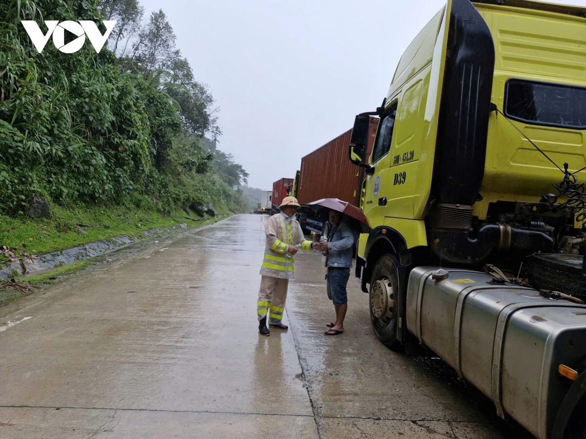 VOV.VN - Chiều 27/10, Đội Cảnh sát giao thông Ngọc Hồi, Phòng Cảnh sát giao thông, Công an tỉnh Quảng Ngãi phối hợp với Tổ SOS đèo Lò Xo tổ chức mang lương thực, nước uống tiếp tế cho khoảng 50 tài xế và phụ xe bị mắc kẹt nhiều ngày trên tuyến đèo do sạt lở nghiêm trọng.