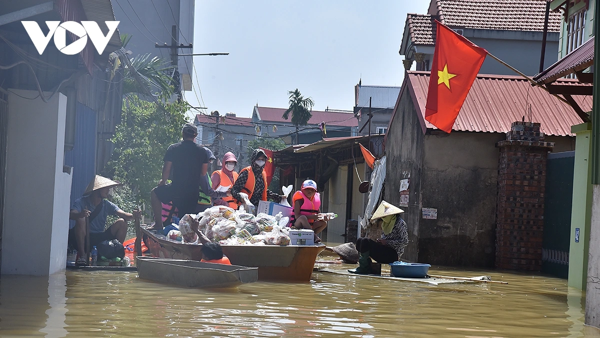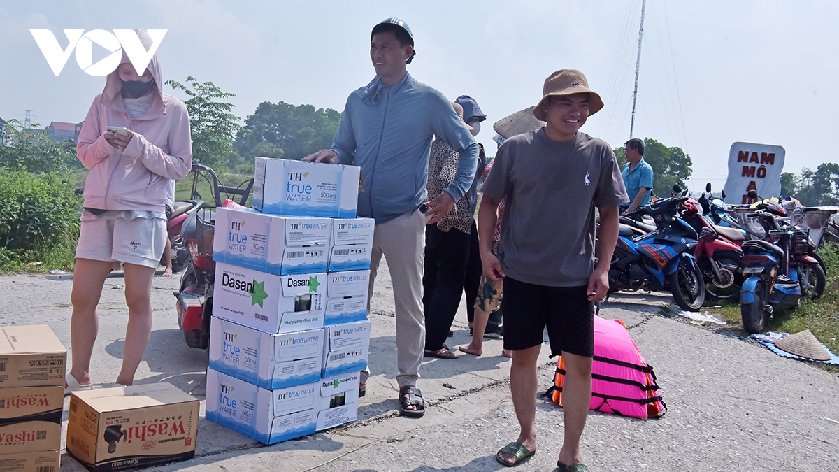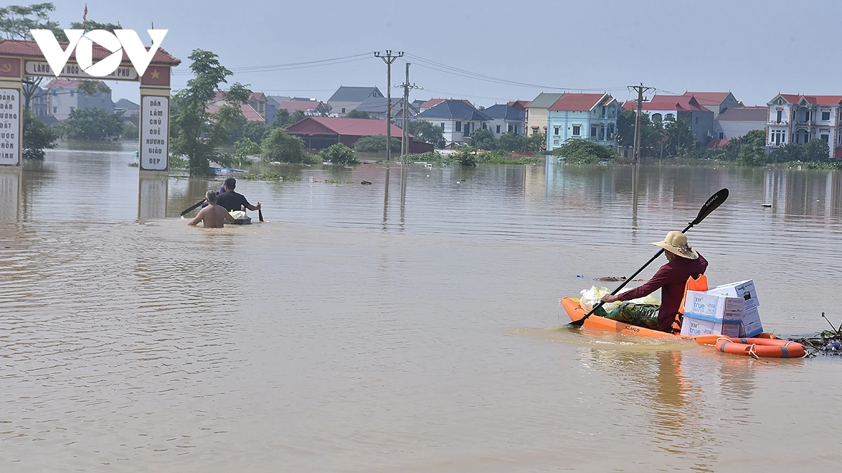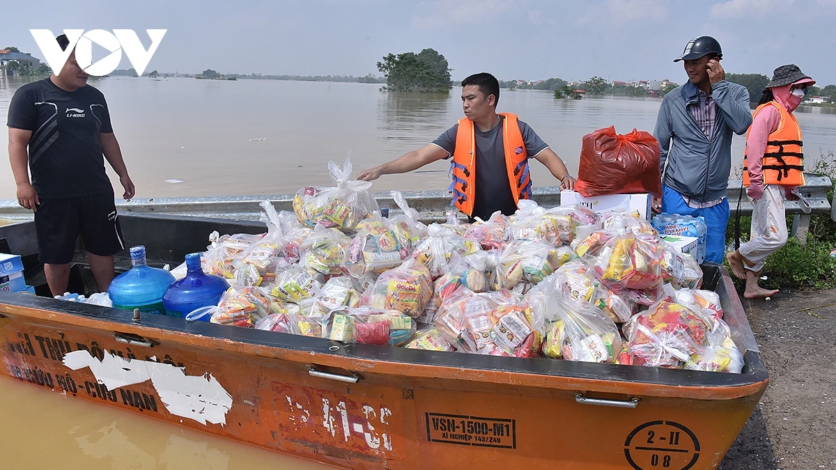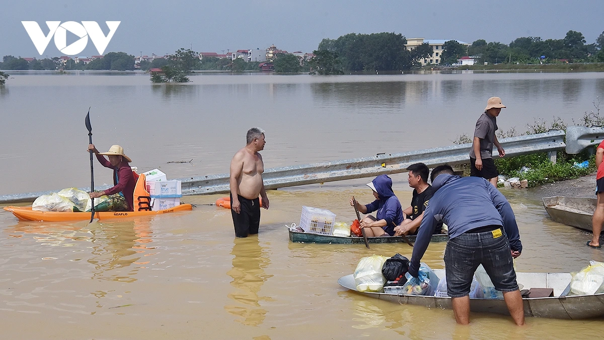 Trưa 10/10, dốc đê xuống thôn Yên Phú biến thành bến thuyền. Đội cảnh sát đường thủy số 1, TP Hà Nội và người dân đã huy động thuyền, bè, ca-nô chở lương thực, nước uống cho những người dân còn bị mắc kẹt trong vùng ngập lũ.