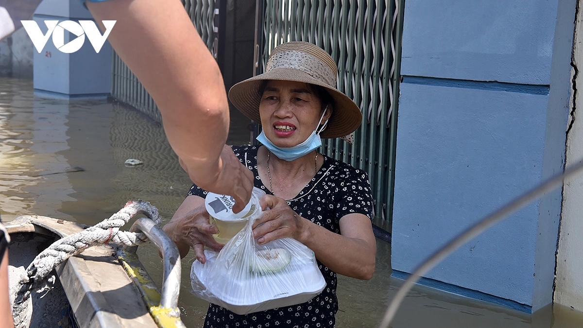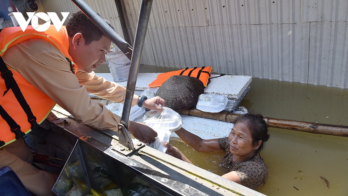 Các chiến sĩ Đội cảnh sát đường thủy số 1 đã kịp thời tiếp tế thức ăn, nước uống cho người dân còn mắc kẹt trong vùng lũ.