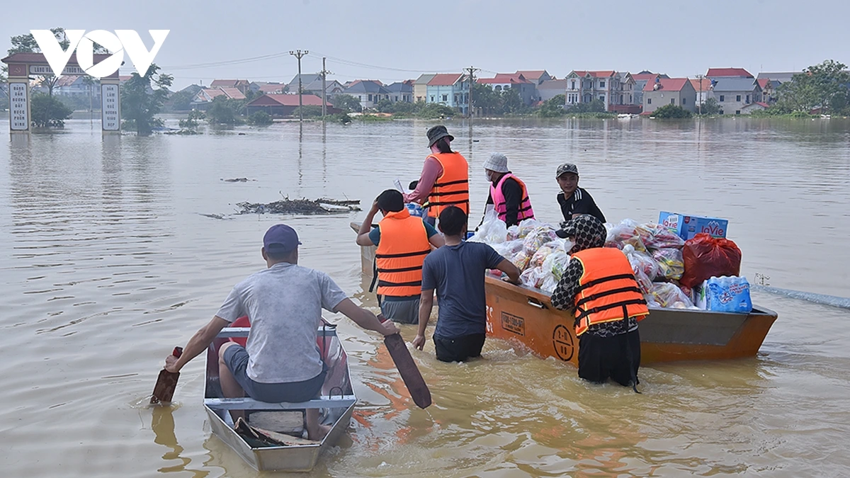 Hàng trăm suất ăn, nước uống đã được tập kết, vận chuyển tới hỗ trợ những người dân tại khu vực bị chia cắt.
