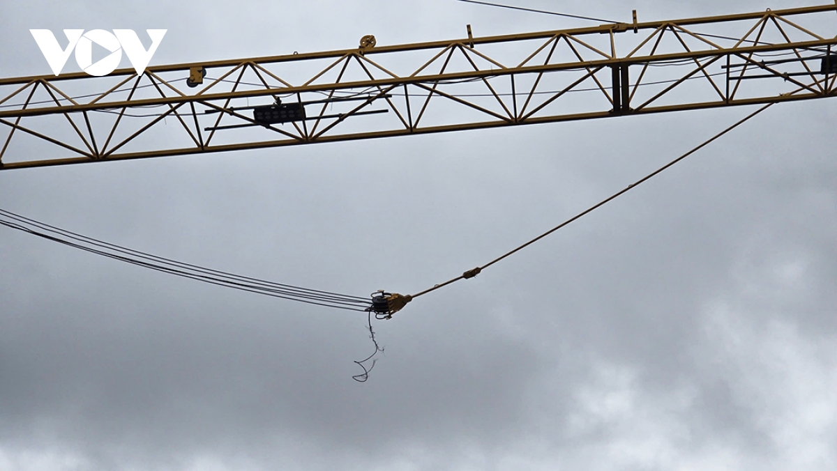 Ghi nhận tại hiện trường, tháp cẩu cao hàng chục mét bị gãy ngang, phần cáp tời bị đứt gãy. Bên dưới có nhiều thanh sắt, thép nằm ngổn ngang. Công an phường Sơn Trà đã đến hiện trường thực hiện nhiệm vụ.
