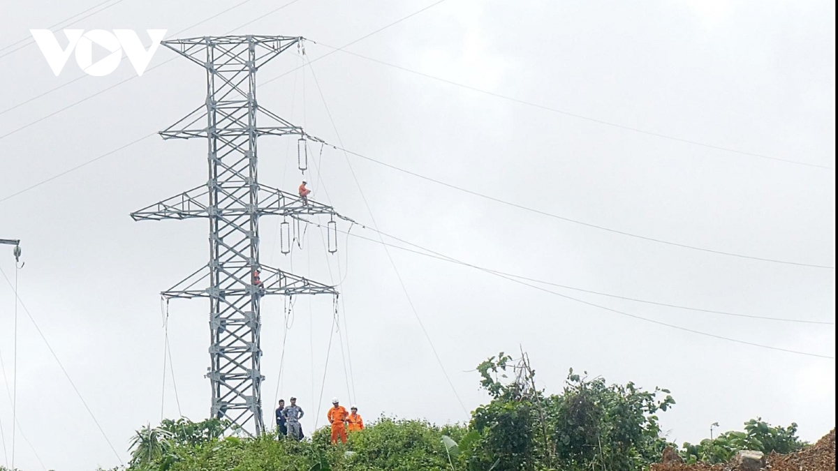 Công nhân Điện lực Đà Nẵng xử lý lưới điện tại khu vực xảy ra sự cố đổ cột 110kV lên xã Phước Sơn, TP Đà Nẵng