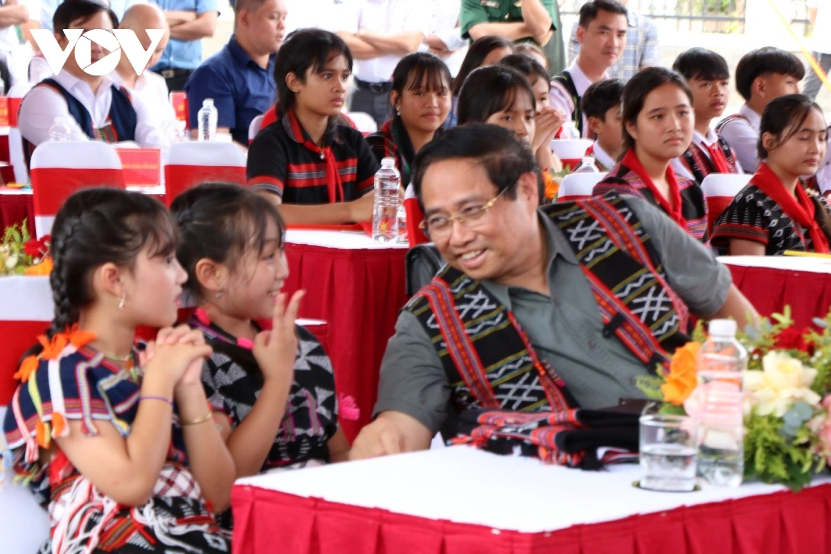 Thủ tướng Chính phủ Phạm Minh Chính vui vẻ trò chuyện cùng học sinh nhân dịp dự Lễ khởi công xây dựng trường bán trú Tây Giang.