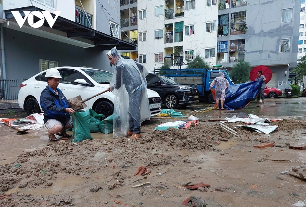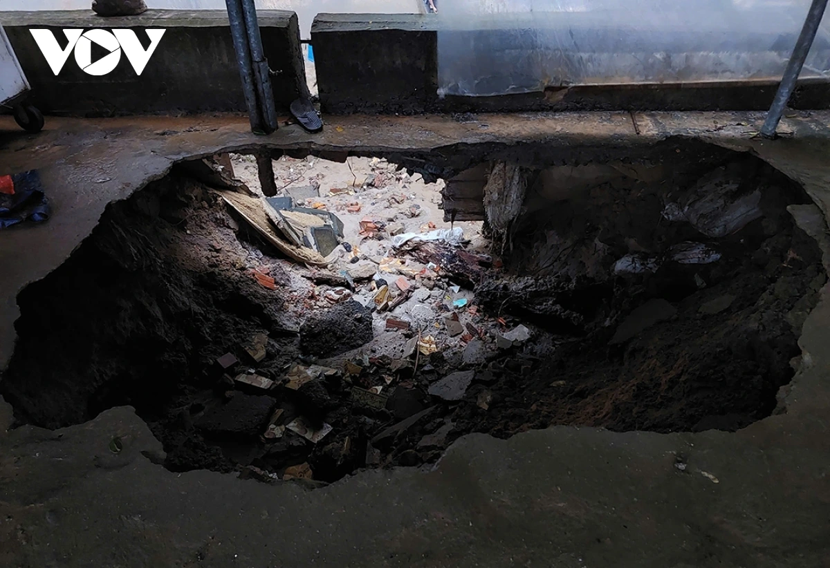 Dòng nước từ đường Âu Cơ đổ mạnh xuống khu vực chung cư nhà ở xã hội Hòa Khánh phía dưới đã làm sụp phần mái taluy sát bên tòa nhà B1, tạo hố sâu hơn 2m, rộng khoảng 2m. Đất, cát, gạch đá bị cuốn tràn xuống khuôn viên, tiềm ẩn nguy cơ mất an toàn cho cư dân sinh sống tại đây.