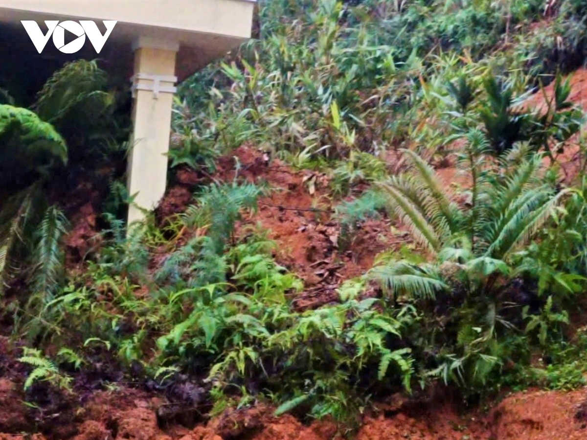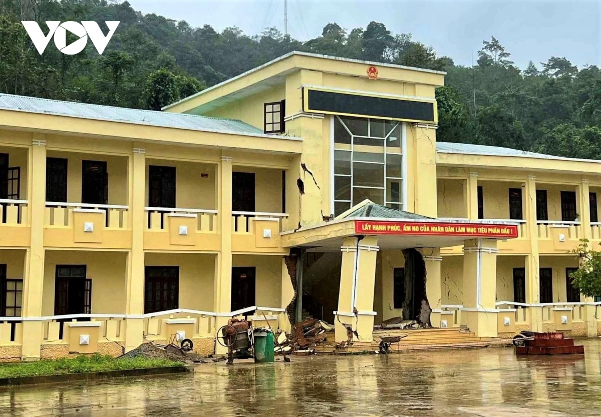 Khu vực trụ sở UBND xã đã xuất hiện nhiều vết nứt lớn, tường nhà bị gãy, kết cấu công trình xô lệch; một số phòng làm việc bị đất đá tràn vào, tiềm ẩn nguy cơ mất an toàn.