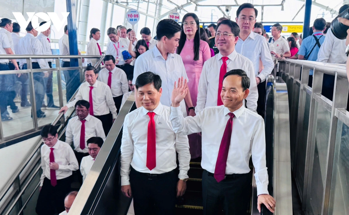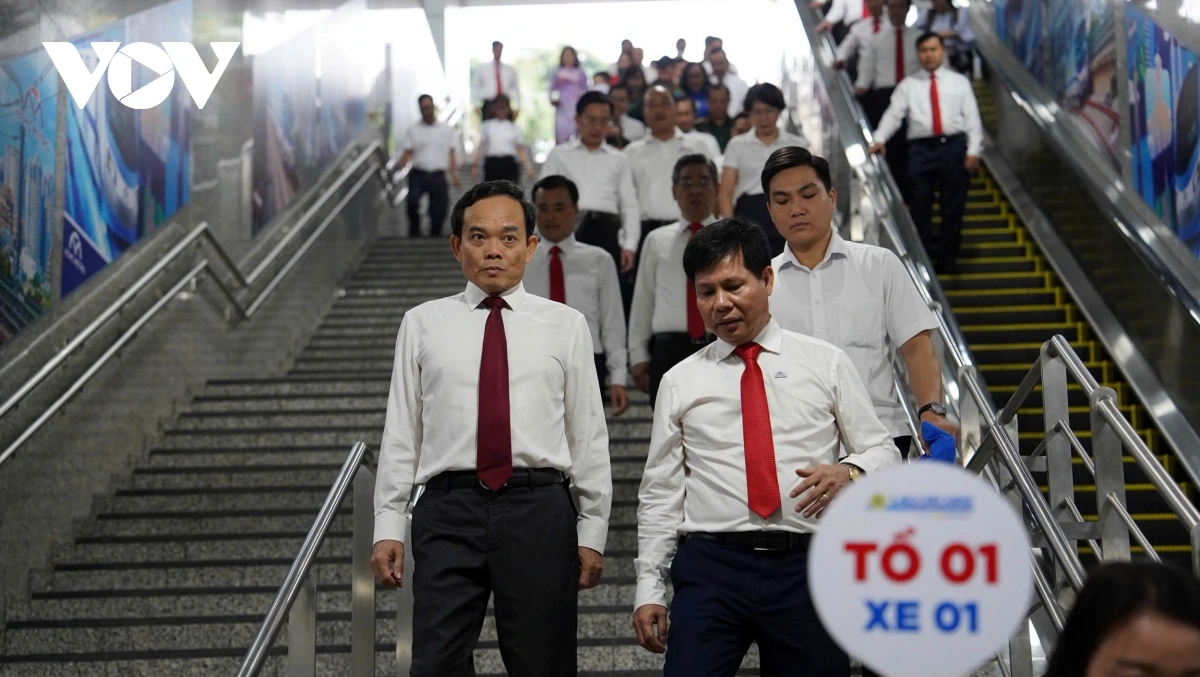 Bí thư Thành ủy Trần Lưu Quang và đoàn xuất phát từ ga Bến Thành của tuyến metro số 1 (Bến Thành- Suối Tiên) (ảnh M.Q)