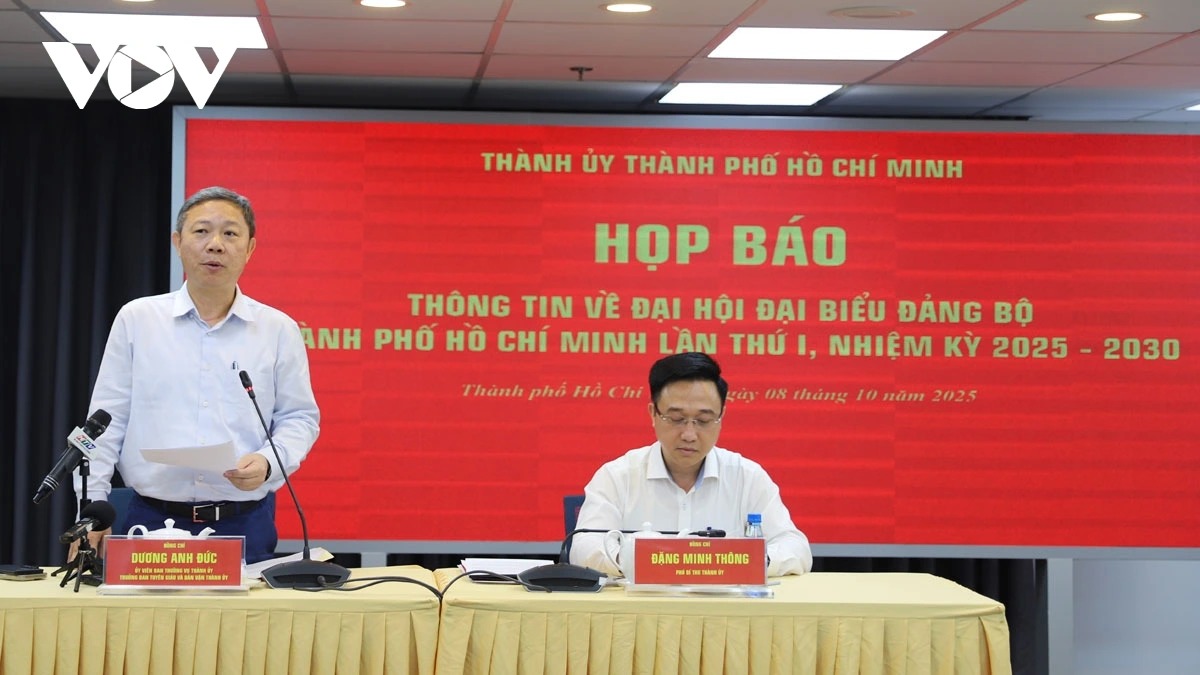 VOV.VN - Chiều 8/10, Thành ủy TP.HCM họp báo công bố Đại hội Đại biểu Đảng bộ TP.HCM lần thứ I (nhiệm kỳ 2025-2030) sẽ diễn ra từ 13-15/10 với 550 đại biểu. Đại hội đặt mục tiêu xây dựng TP.HCM thành siêu đô thị, đồng thời ứng dụng mạnh mẽ chuyển đổi số trong công tác tổ chức.