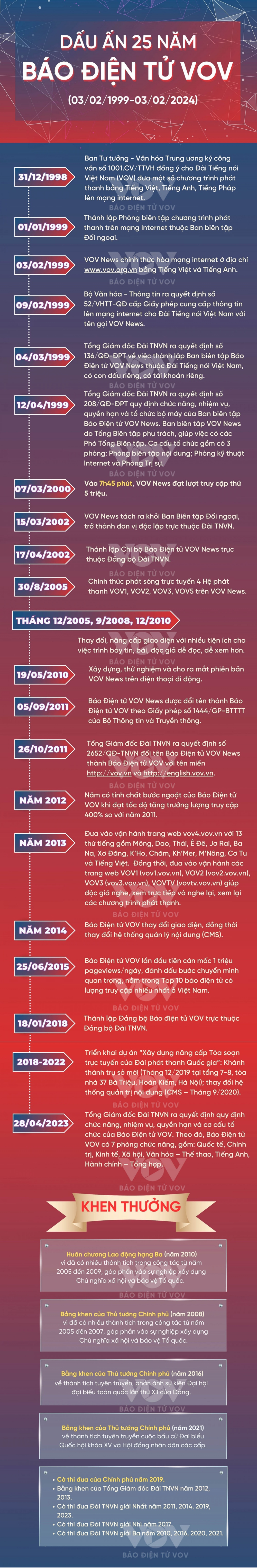 VOV.VN - Dưới đây là những dấu mốc và thành tựu đáng chú ý trong chặng đường 25 năm của Báo Điện tử VOV (03/02/1999-03/02/2024).