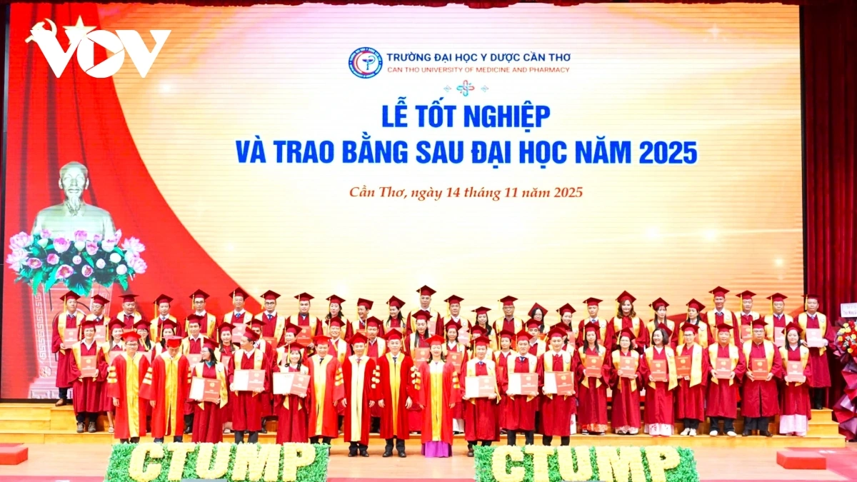 Chiều 14/11, Trường Đại học Y Dược Cần Thơ trao bằng tốt nghiệp sau đại học đợt 2 năm 2025 cho 151 tân khoa Thạc sĩ (Cao học), 216 tân khoa Bác sĩ chuyên khoa cấp II, 140 tân khoa Bác sĩ nội trú, 67 tân khoa Bác sĩ chuyên khoa cấp I.