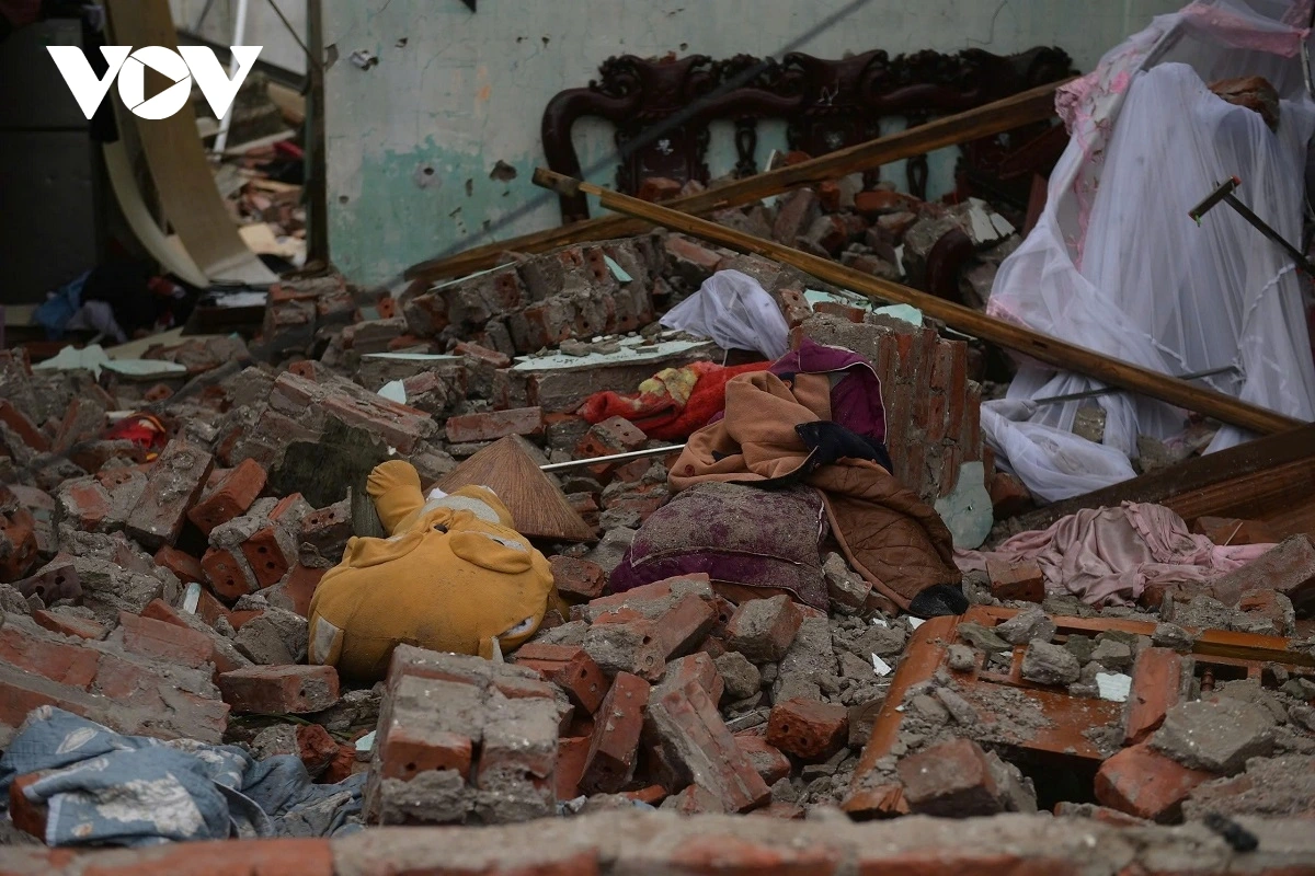 Trong ngôi nhà cũ kỹ của ông K. (1934) và bà N. (1938) giờ chỉ còn là đống gạch vụn. Trận lốc xoáy quái ác ập đến lúc 4h30 sáng, trong tích tắc đã cướp đi sinh mạng của hai vợ chồng già, để lại nỗi đau không gì bù đắp cho gia đình và xóm làng. Anh Khoa, con trai út may mắn thoát chết, nhưng bàn tay và bờ hông dính thương tích, chưa kịp băng bó xong đã phải thẫn thờ ngồi bên di ảnh cha mẹ, đôi mắt đỏ hoe.