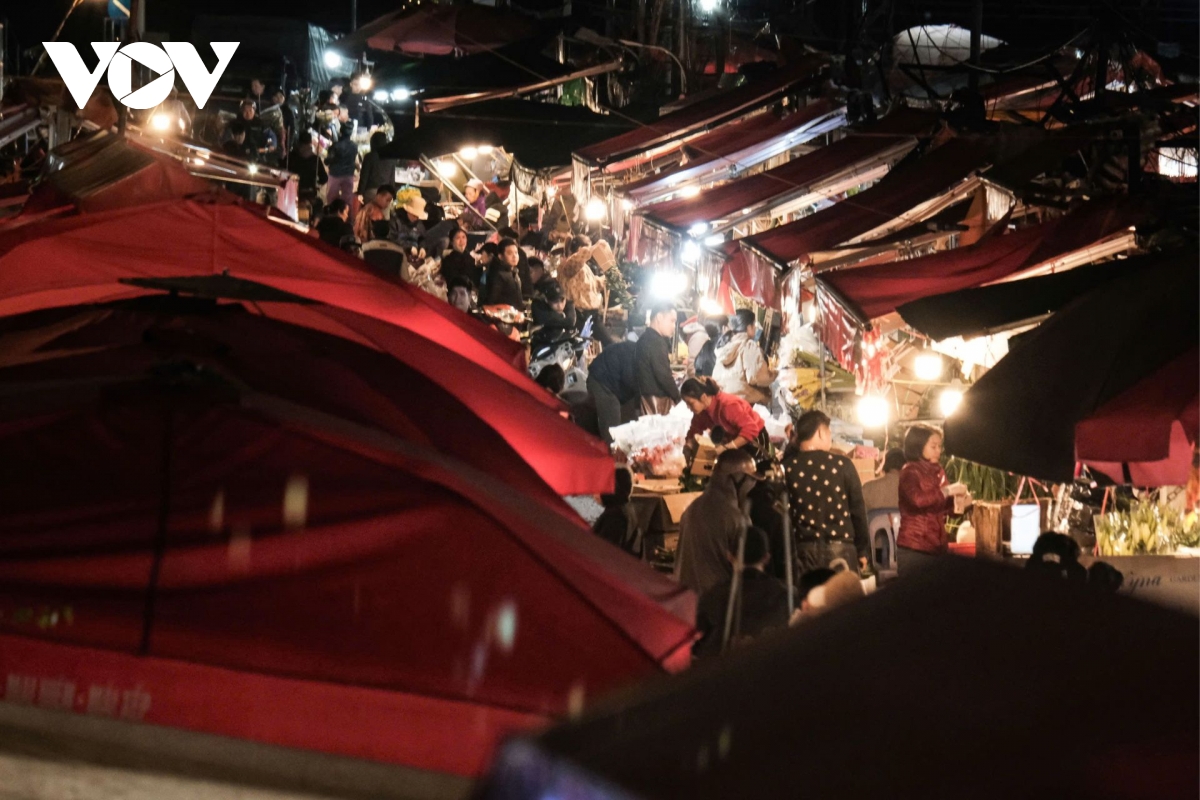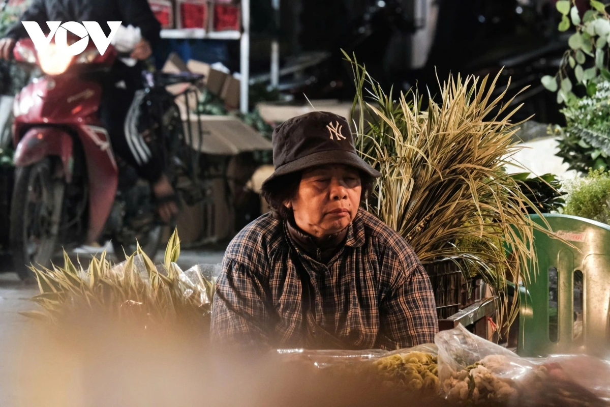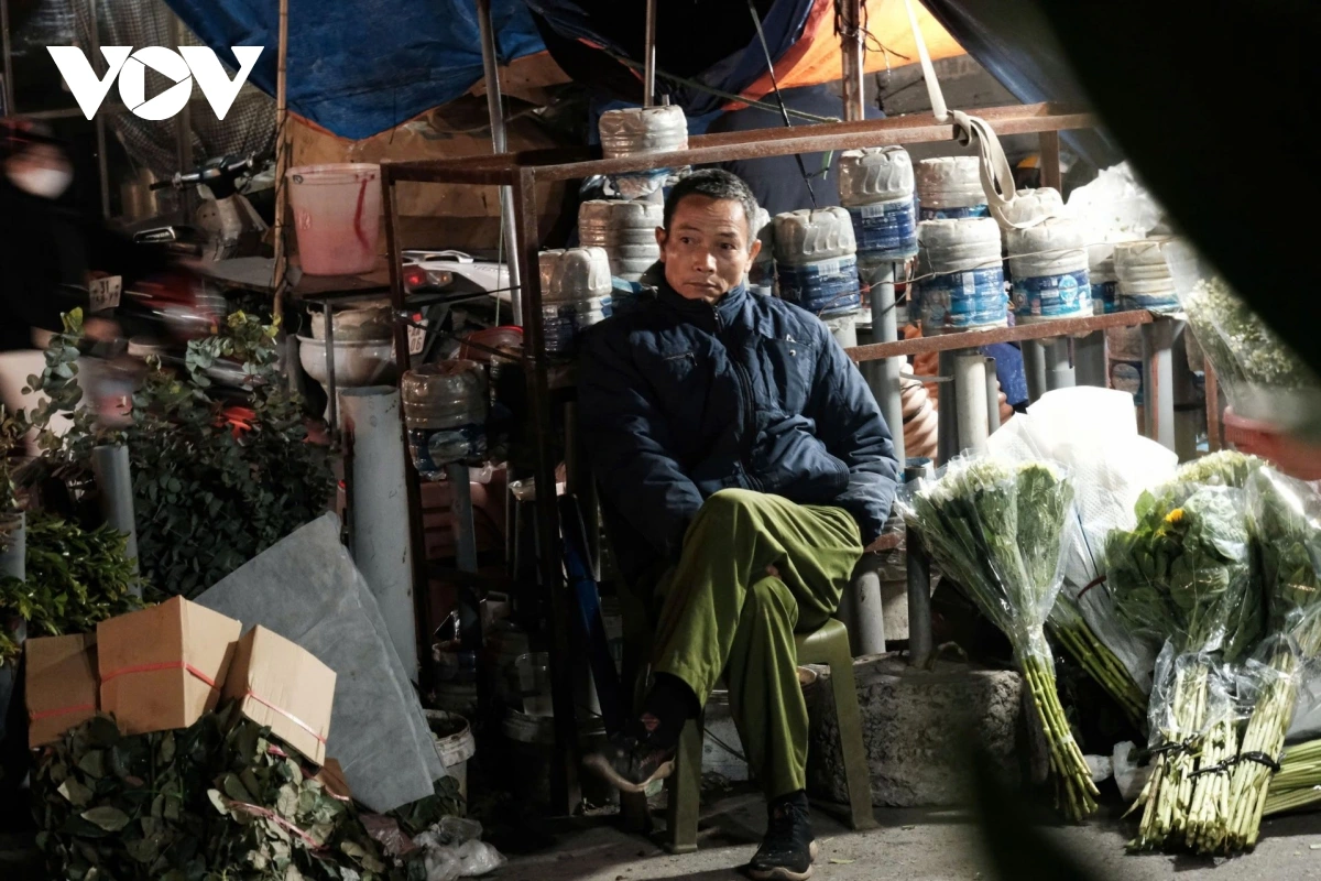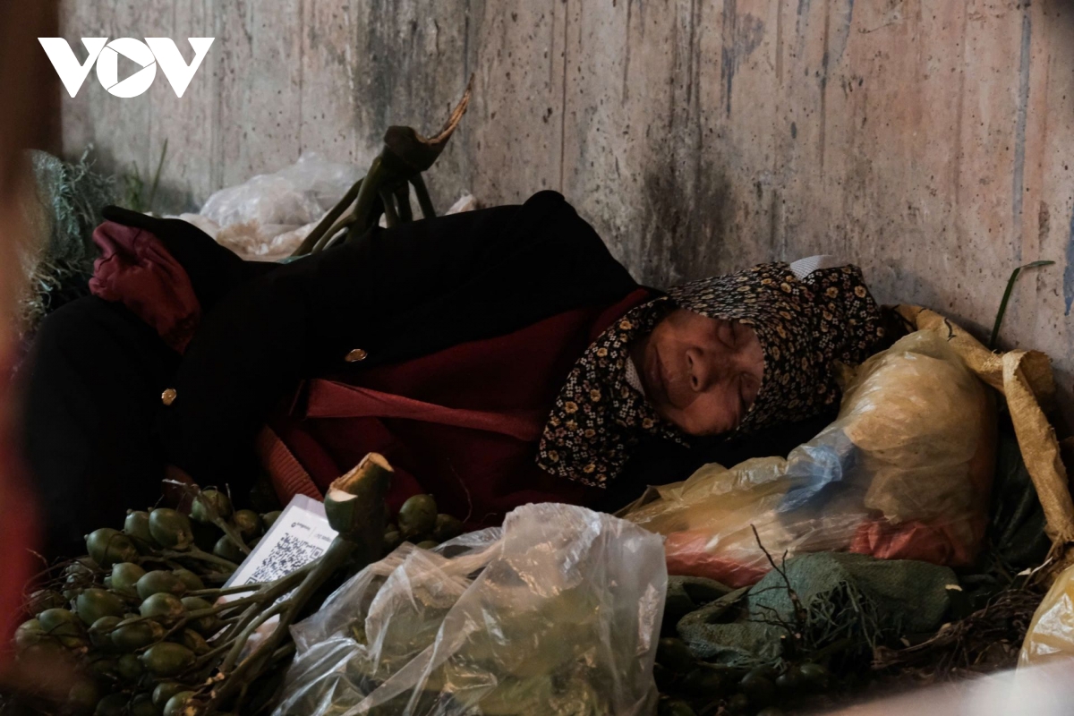 Giữa trời lạnh đầu mùa, nhiều tiểu thương sau một ngày dài buôn bán nằm co ro trong một góc chợ, tranh thủ chợp mắt để lấy lại sức. Dưới làn gió se lạnh và hơi sương mỏng, hình ảnh những người lao động mệt nhọc tựa vào nhau hay quấn trong lớp áo dày thêm khiến không khí chợ về đêm vừa tĩnh lặng vừa thấm đẫm sự vất vả, cần mẫn của họ.