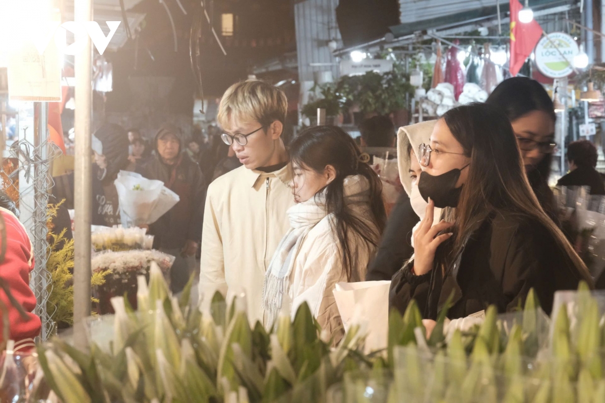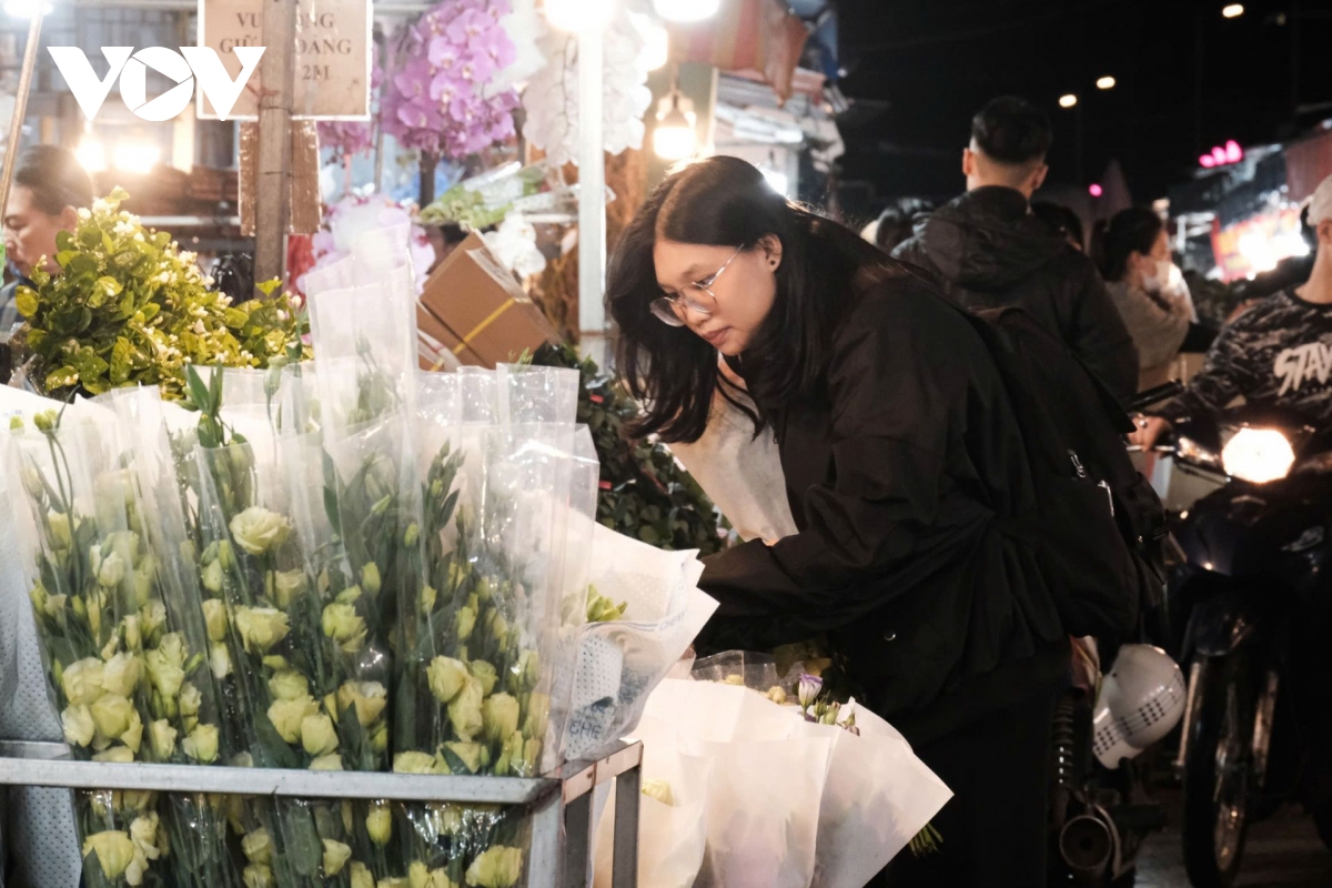 Dạo một vòng quanh chợ từ 11 giờ đêm, Trang Nhung, sinh viên Trường Đại học Quốc gia tìm mua một bó hoa ưng ý để tặng mẹ nhân dịp 20/11. Nhung cho biết dù đã mặc thêm hai lớp áo, em vẫn cảm nhận rõ cái lạnh, nhưng việc tự tay đến chợ chọn hoa rồi về tự trang trí khiến món quà trở nên ý nghĩa hơn, nhất là khi mẹ em cũng là giáo viên. “Sáng mai em sẽ về nhà sớm ở Phú Thọ để tạo bất ngờ cho mẹ. Hy vọng mẹ sẽ thích món quà này. Như vậy, dù phải đi đêm lạnh để chọn hoa, em vẫn thấy xứng đáng”, Nhung nói.