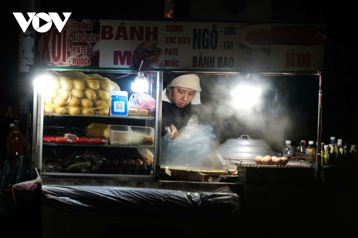 Càng về khuya, nền nhiệt càng giảm sâu. Người qua lại thưa dần, nhường chỗ cho những tuyến phố chìm trong màn rét và lớp sương mỏng. Thời tiết buốt lạnh khiến các món ăn nóng vỉa hè trở nên đông khách hơn hẳn. Từ nồi ngô luộc nghi ngút khói đến những vỉ chả nướng thơm lừng… đều thu hút người dừng lại, vừa mua chút đồ ăn nóng, vừa tranh thủ sưởi hơi ấm lan ra từ bếp.