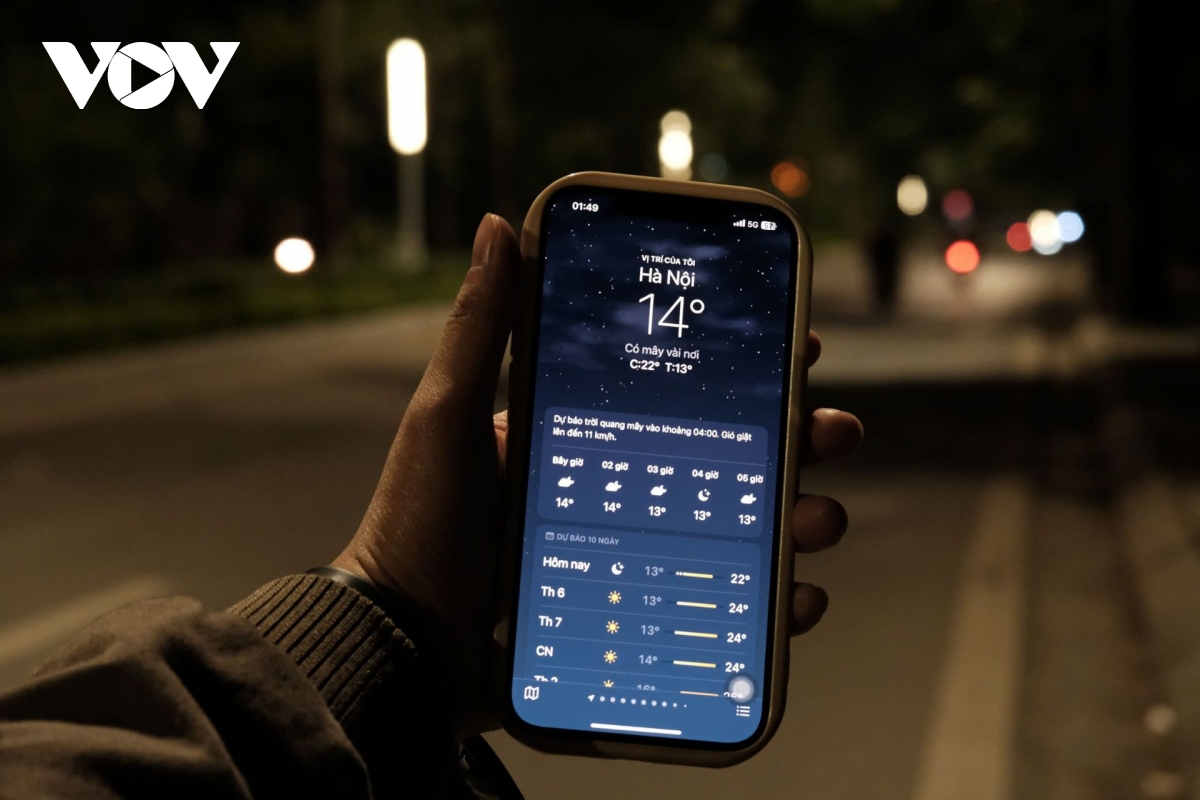 Dù không còn mưa nhưng nhiệt độ về đêm vẫn chỉ quanh mức từ 13-14°C. Trời về đêm đã đỡ rét hơn so với ngày đầu của đợt không khí lạnh đầu mùa, nhưng những cơn gió lạnh buốt vẫn khiến người đi đường co ro, dù họ đã mặc nhiều lớp áo.