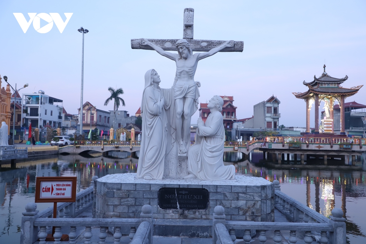 Qua cổng nhà thờ, lối đi quanh hồ nước dẫn vào khoảng sân rộng, nơi đức tin và vẻ đẹp bình yên giao hòa trong từng góc nhỏ.