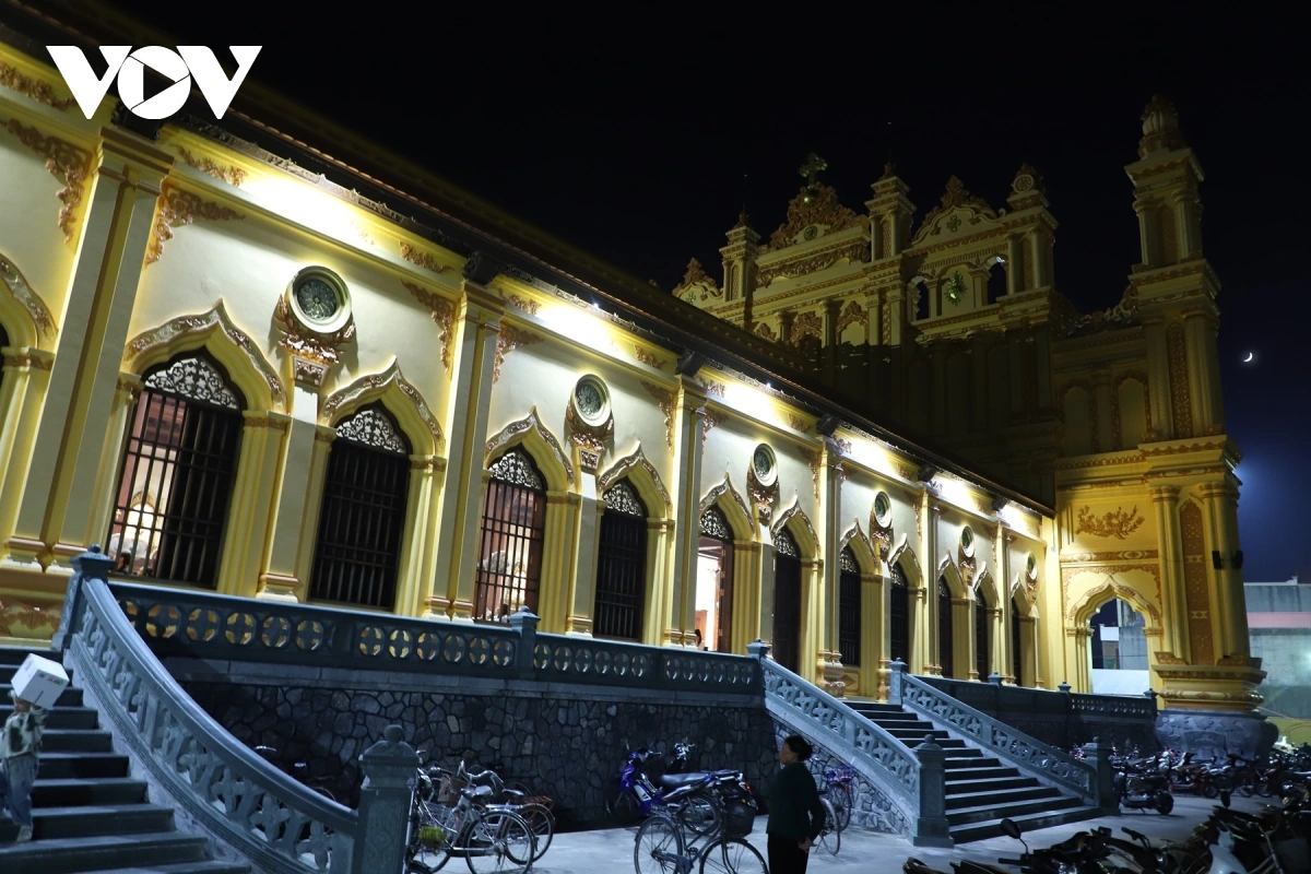Những vòm mái, tháp chuông và ô cửa kính lung linh trong ánh sáng đêm - thánh đường Trung Lao tựa bức họa huyền ảo giữa lòng xứ đạo.