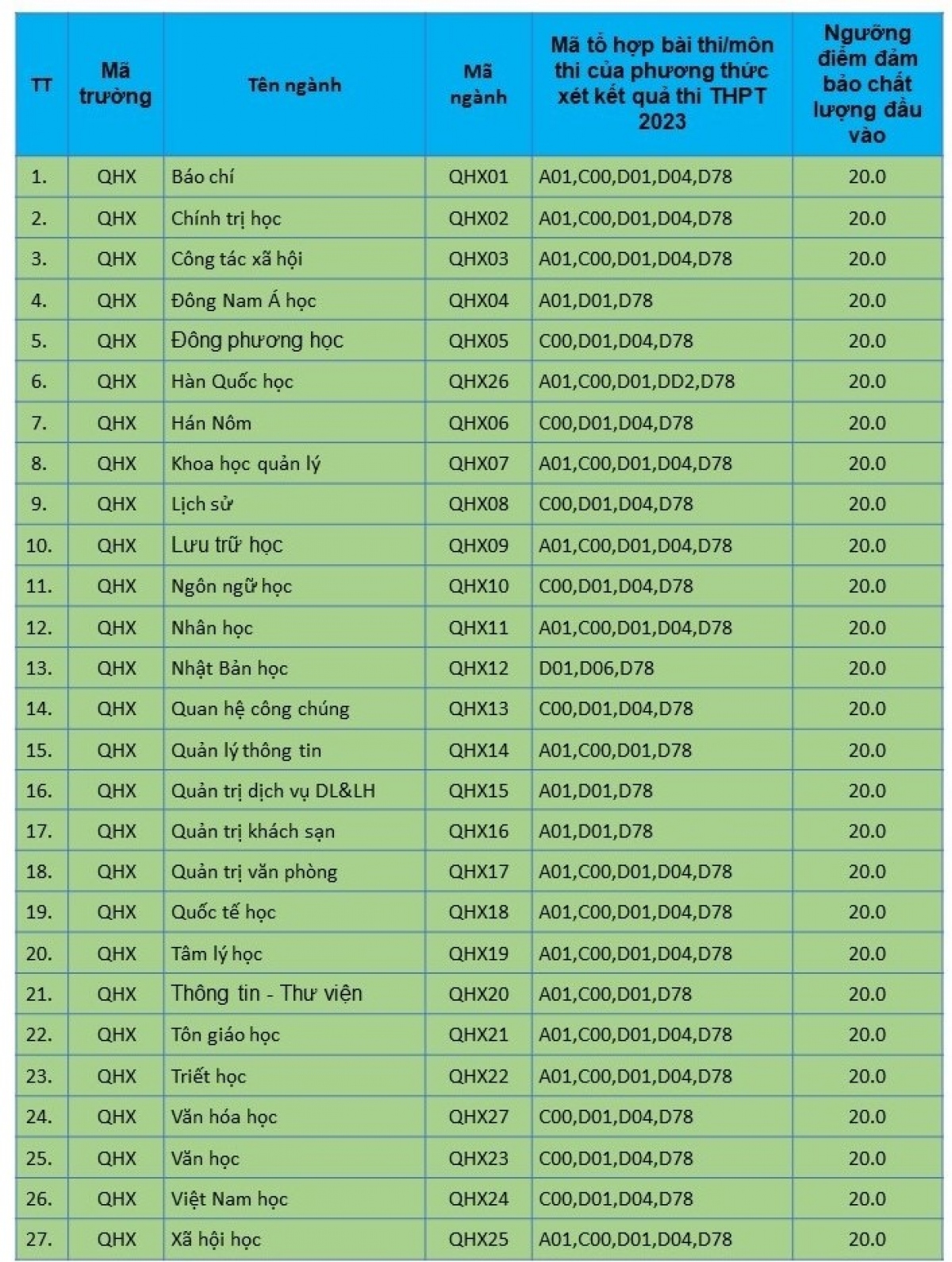 VOV.VN - Trường Đại học Khoa học Xã hội và Nhân văn (ĐH Quốc gia Hà Nội) vừa thông báo ngưỡng điểm đảm bảo chất lượng đầu vào đại học chính quy (mức điểm nhận đăng ký xét tuyển) đối với phương thức xét tuyển kết quả thi tốt nghiệp THPT năm 2023.
