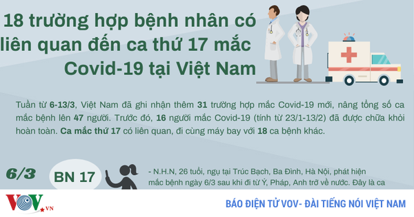 VOVVN - VOV.VN- Tuần từ 6-13/3, Việt Nam có thêm 31 ca mắc Covid-19 mới, nâng tổng số ca mắc bệnh lên 47 người. Bệnh nhân 17 liên quan, đi cùng máy bay với 18 ca khác.