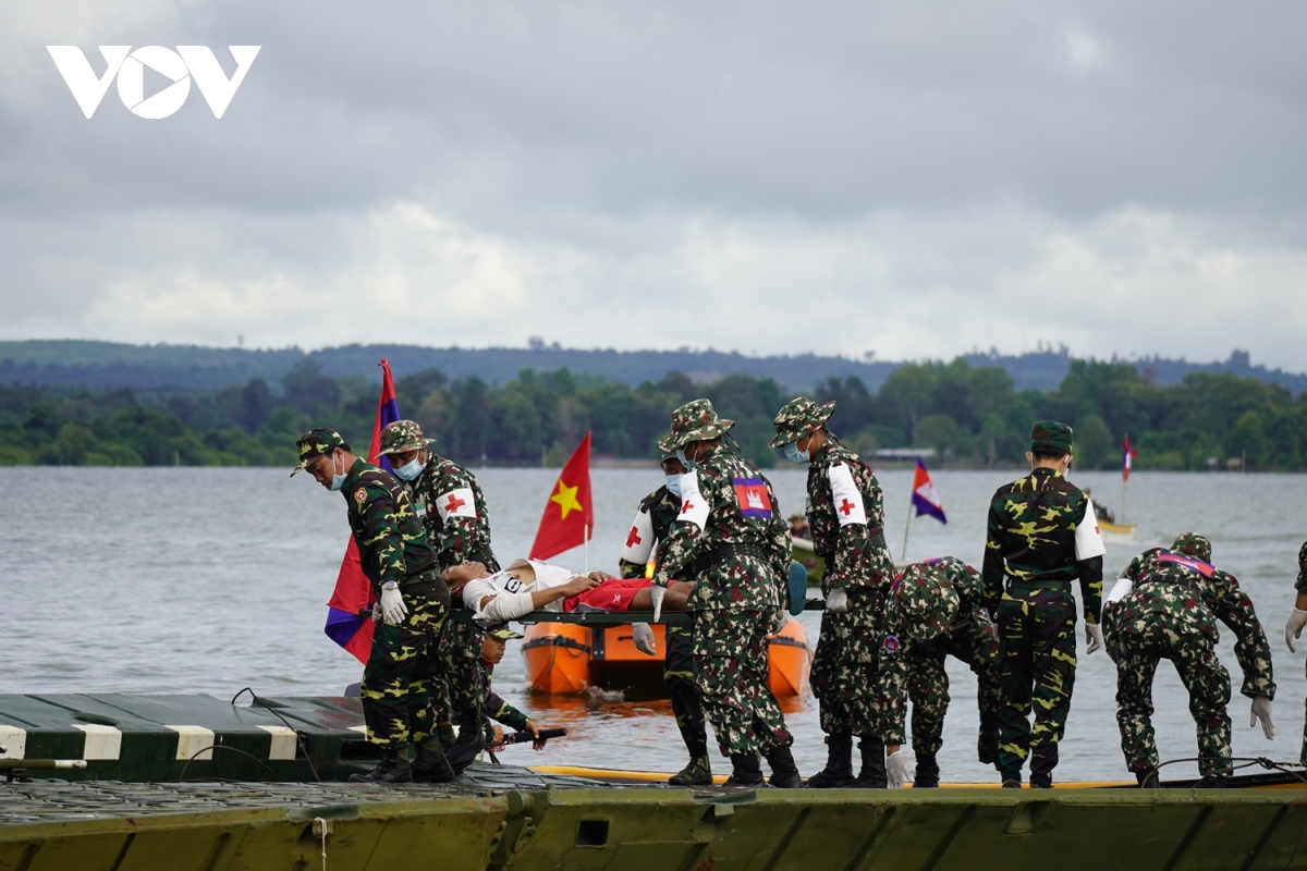 Đối với nội dung tìm kiếm, cứu hộ và giúp đỡ người gặp nạn do lũ lụt, lực lượng quân đội ba nước thực hành tuần tra, tìm kiếm người gặp nạn trong phạm vi khu vực lũ lụt theo các điểm bằng thuyền và máy bay không người lái; cứu nạn và giúp đỡ người gặp nạn còn mắc kẹt trong các ngôi nhà, trên cây và khu vực bị cô lập; cứu nạn và giúp đỡ người gặp nạn bị thương tích do nước cuốn trôi; tổ y tế khẩn cấp sơ cứu người bị nạn trước khi chuyển đến Bệnh viện dã chiến.