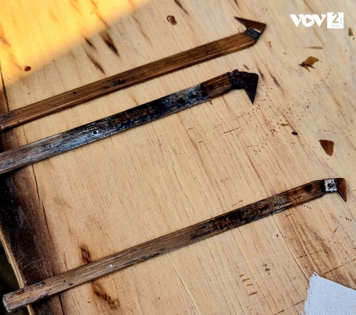 Cây bút vẽ sáp ong được thiết kế bởi một thanh tre và hai lá đồng. Ở giữa hai lá đồng này có một ô trống nhỏ là nơi chứa sáp ong. Người phụ nữ khi vẽ chỉ cần đặt bút vào bát sáp ong đã được đun nóng, điều chỉnh lượng sáp ong sao cho vừa đủ để vẽ lên trên nền vải. Từ đó tạo nên những hoa văn đẹp, độc đáo, ý nghĩa, mang theo cả thông điệp về tình yêu, cuộc sống...