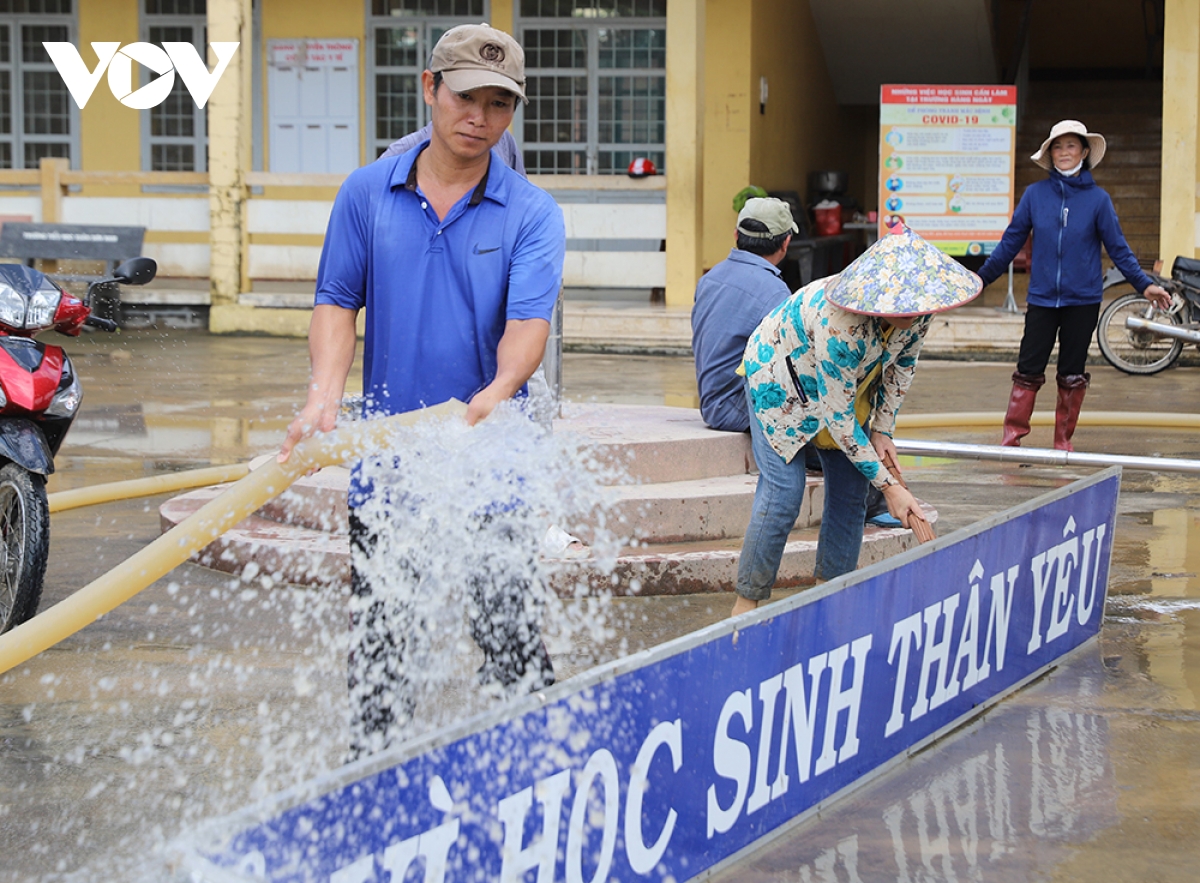 Thầy Lê Văn Đệ chia sẻ: "Bàn ghế, đồ dùng học tập, máy tính chúng tôi đã chủ động sắp xếp đưa lên tầng 2 từ trước bão. Sau khi nước rút, chúng tôi đã huy động giáo viên, nhân viên là cứ nước rút tới đâu thì dọn dẹp vệ sinh sạch sẽ tới đó. Đến thời điểm này các phòng học đã sạch sẽ; phần rác bèo trôi thì tập kết phía ngoài trường chờ lực lượng dân quân, công an tới hỗ trợ vận chuyển đi".