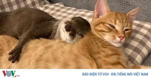 VOVVN - VOV.VN - Trong đoạn video, rái cá tựa đầu vào lưng mèo, nằm ở tư thế thoải mái nhất, sau đó nhắm mắt ngủ ngon lành. Còn mèo cũng không hề tỏ ra khó chịu.