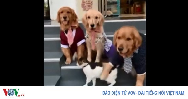VOVVN - VOV.VN - Thay vì nhanh chóng hoàn thành bức ảnh gia đình, những chú chó phải chờ đến khi kéo được "người bạn" mèo vào khung hình thì mới "vừa lòng".