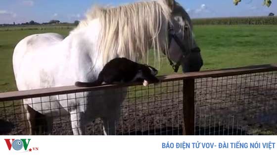 VOVVN - VOV.VN - Bất chấp sự thật là ngựa lớn gấp ít nhất 10 lần so với mèo, nhưng cả 2 đều không để sự khác biệt xen vào giữa tình bạn chân thành của mình.