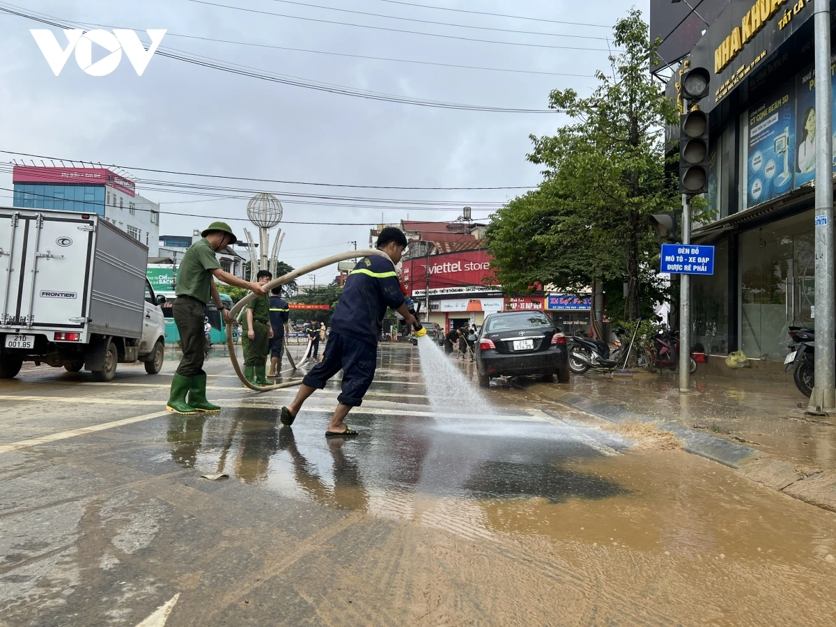 Không khí khẩn trương, đoàn kết lan tỏa trên đường phố, thể hiện tinh thần chủ động, đồng lòng vượt qua khó khăn của người dân vùng lũ. Chị Vũ Thị Phương Hoa ở khu vực ngã năm Cao Lanh, đường Điện Biên, phường Yên Bái cho biết: "Các anh bộ đội, công an đã hỗ trợ dọn rửa giúp bà con khu phố. Chúng em sáng nay cũng đến sớm để dọn dẹp, do lớp bùn khá mỏng nên dọn cũng nhanh".