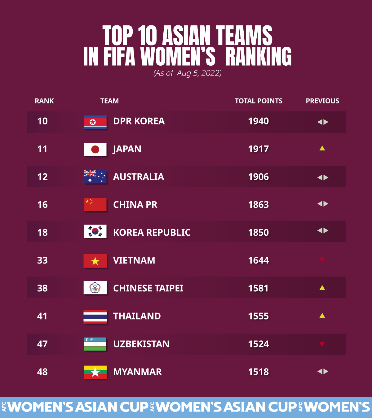 Theo đó, do thi đấu không tốt ở giải bóng đá nữ Đông Nam Á nên ĐT nữ Việt Nam tụt 1 hạng xuống vị trí thứ 33 trong khi ĐT nữ Thái Lan tăng 2 hạng lên vị trí 41. ĐT nữ Philippines dù vô địch khu vực nhưng vẫn giữ nguyên vị trí 53. Trên bình diện châu Á, vị trí 33 thế giới giúp ĐT nữ Việt Nam xếp hạng 6 sau các đội Triều Tiên (10), Nhật Bản (11), Australia (12), Trung Quốc (16) và Hàn Quốc (18).