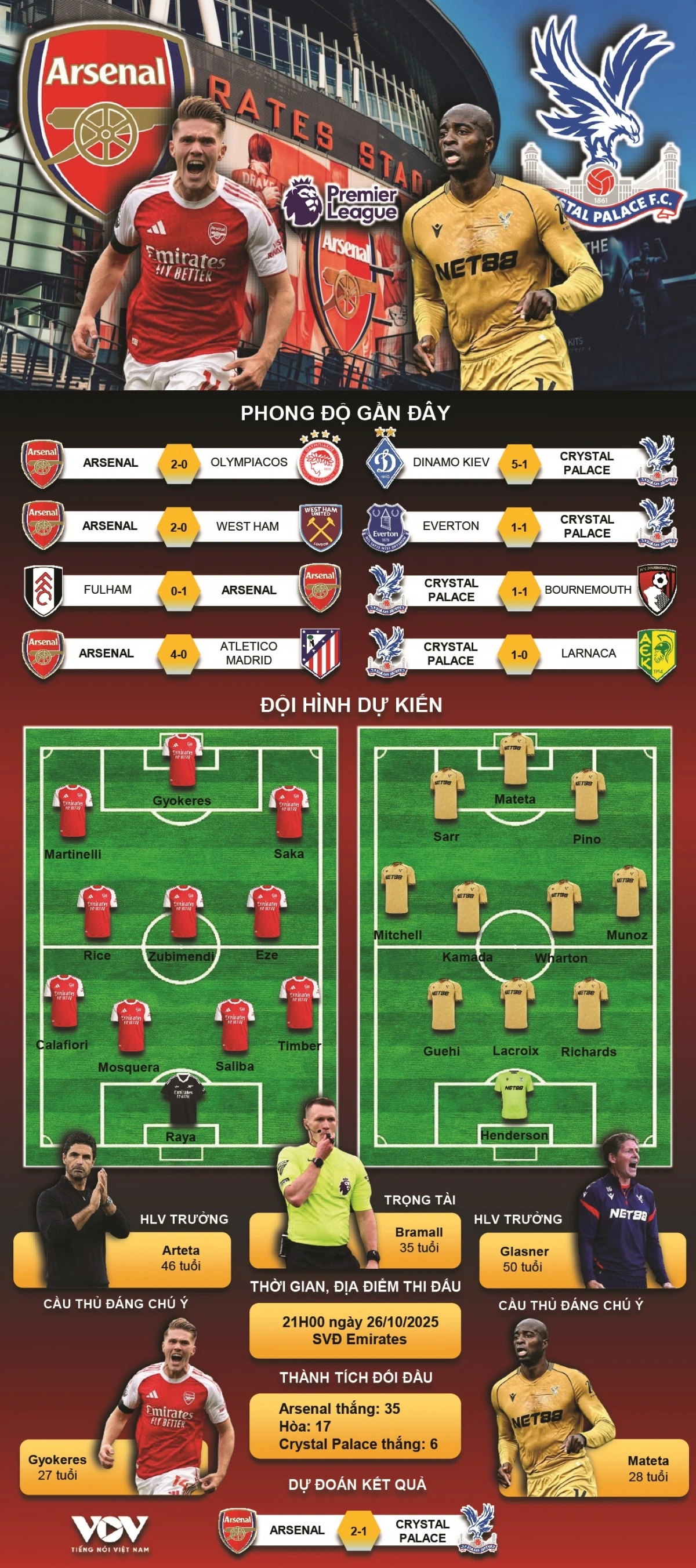 VOV.VN - Dự đoán kết quả và đội hình ra sân trận Arsenal vs Crystal Palace thuộc khuôn khổ vòng 9 Ngoại hạng Anh 2025/2026 diễn ra lúc 21h00 ngày 26/10.