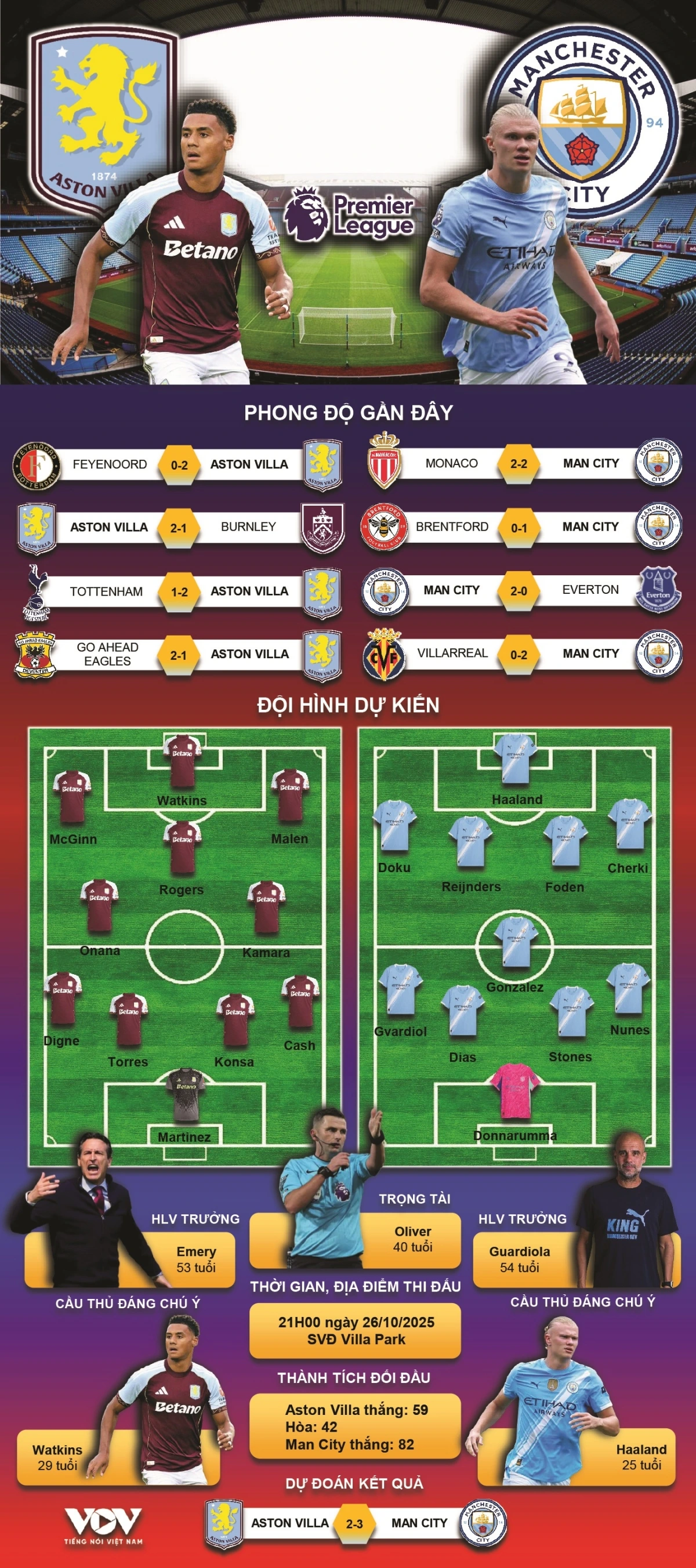 VOV.VN - Dự đoán kết quả và đội hình ra sân trận Aston Villa vs Man City thuộc khuôn khổ vòng 9 Ngoại hạng Anh 2025/2026 diễn ra lúc 21h00 ngày 26/10.