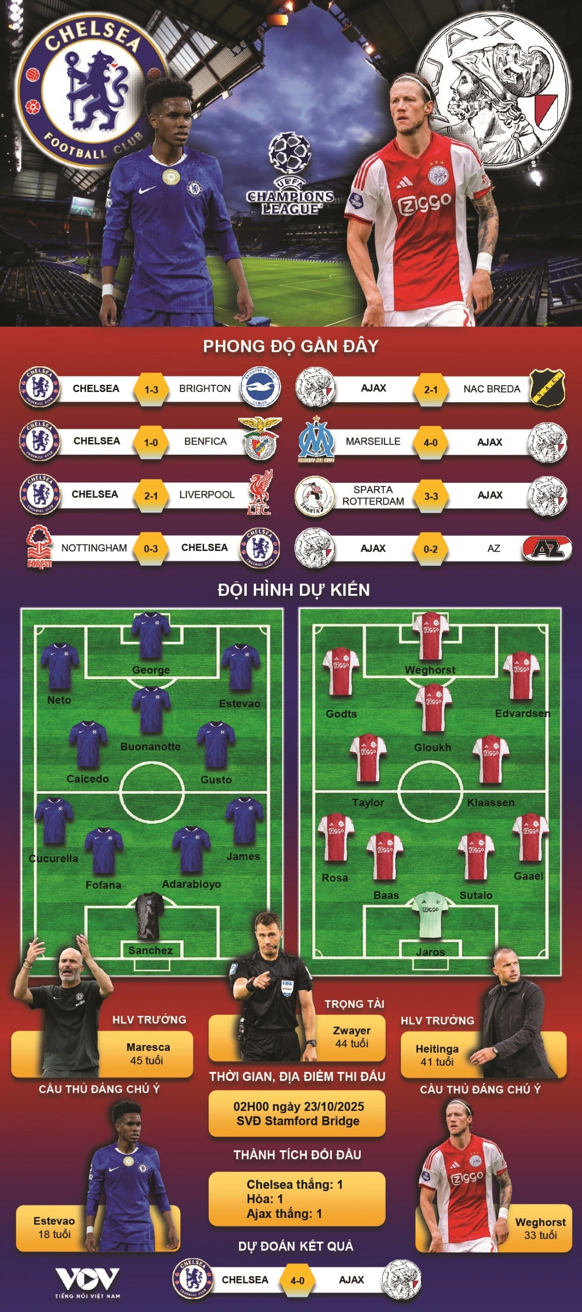 VOV.VN - Dự đoán kết quả và đội hình ra sân trận Chelsea vs Ajax thuộc khuôn khổ vòng bảng Cúp C1 châu Âu 2025/2026 diễn ra lúc 02h00 ngày 23/10.