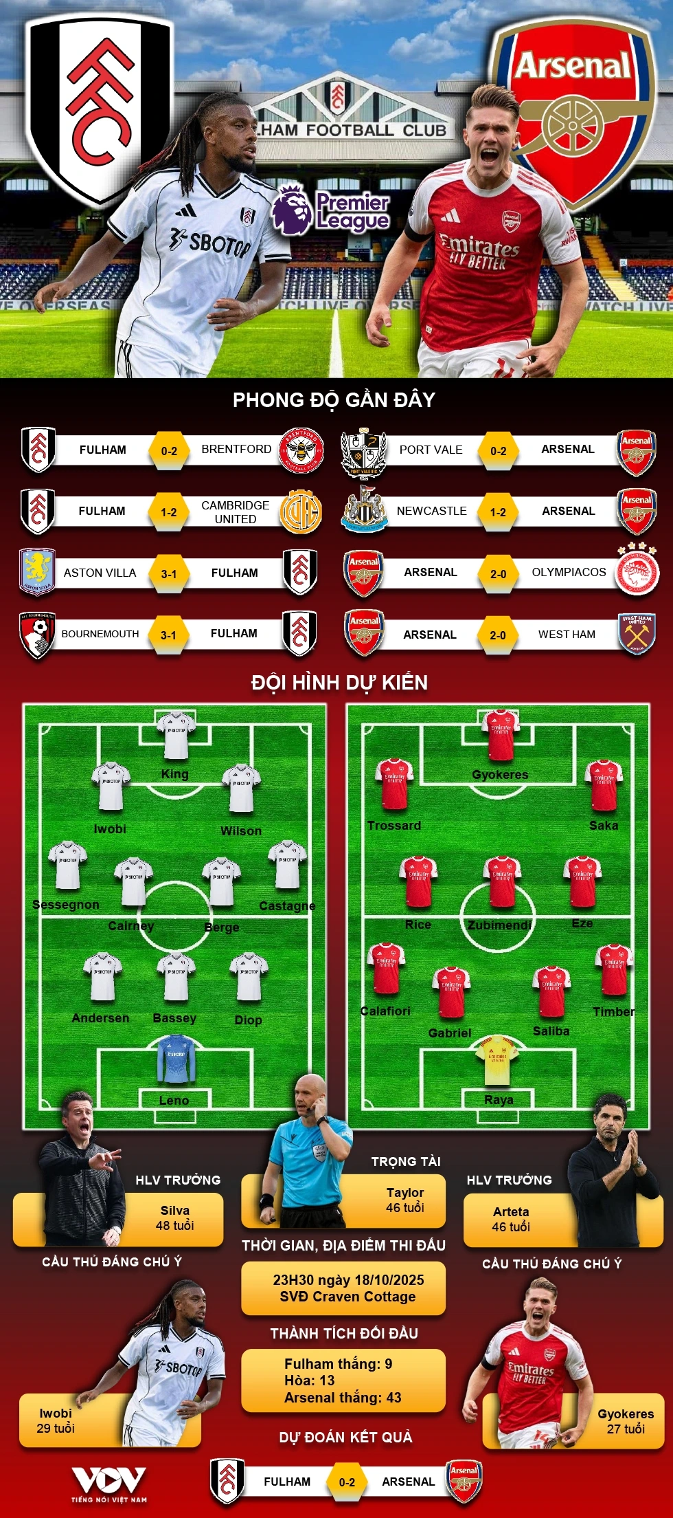 VOV.VN - Dự đoán kết quả và đội hình ra sân trận Fulham vs Arsenal thuộc khuôn khổ vòng 8 Ngoại hạng Anh 2025/2026 diễn ra lúc 23h30 ngày 18/10.