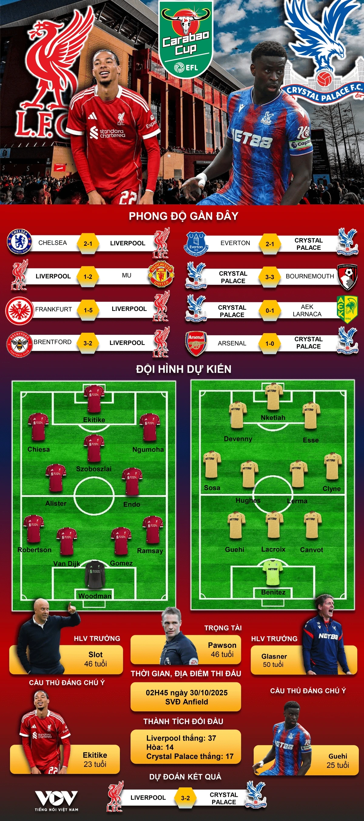 VOV.VN - Dự đoán kết quả và đội hình ra sân trận Liverpool vs Crystal Palace, vòng 4 Cúp Liên Đoàn Anh diễn ra lúc 2h45 rạng sáng 30/10 theo giờ Việt Nam.