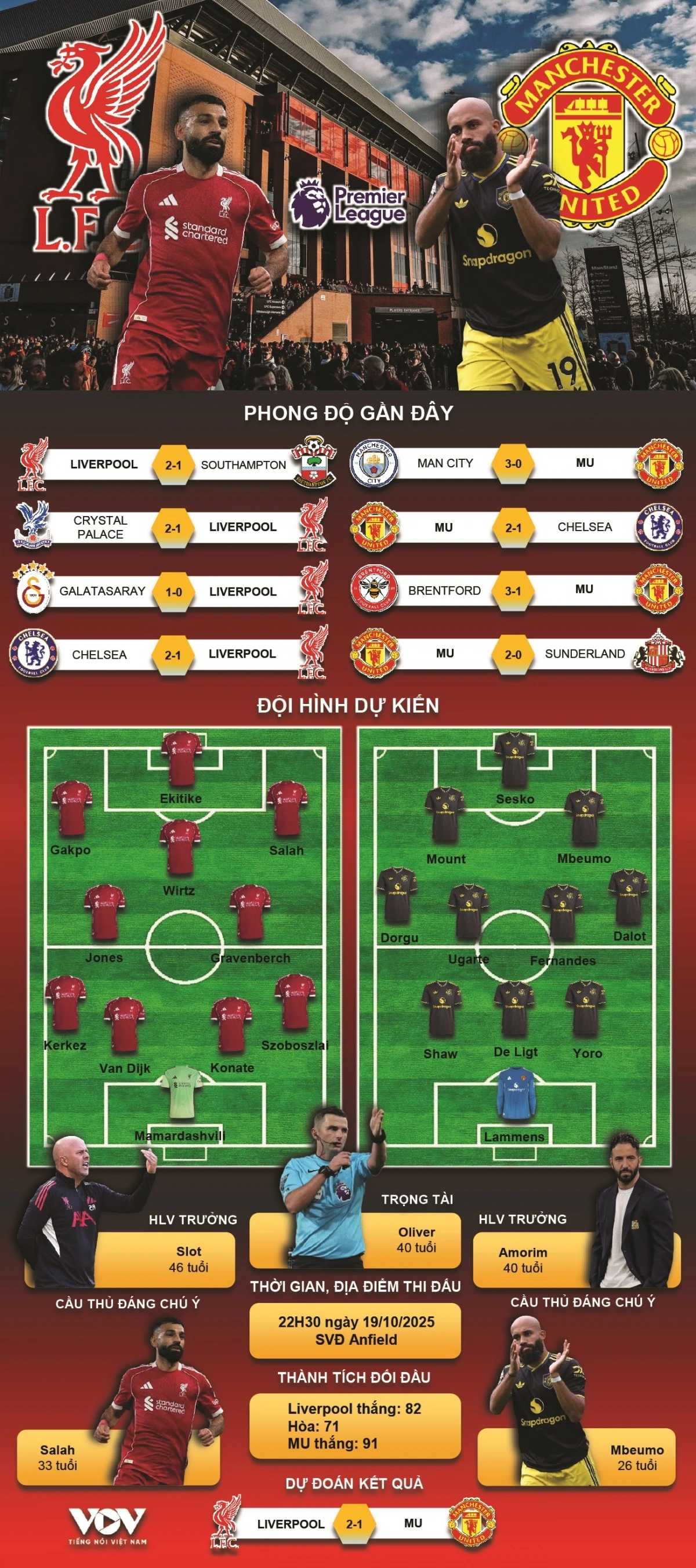 VOV.VN - Dự đoán kết quả và đội hình ra sân trận Liverpool vs MU thuộc khuôn khổ vòng 8 Ngoại hạng Anh 2025/2026 diễn ra lúc 22h30 ngày 19/10.