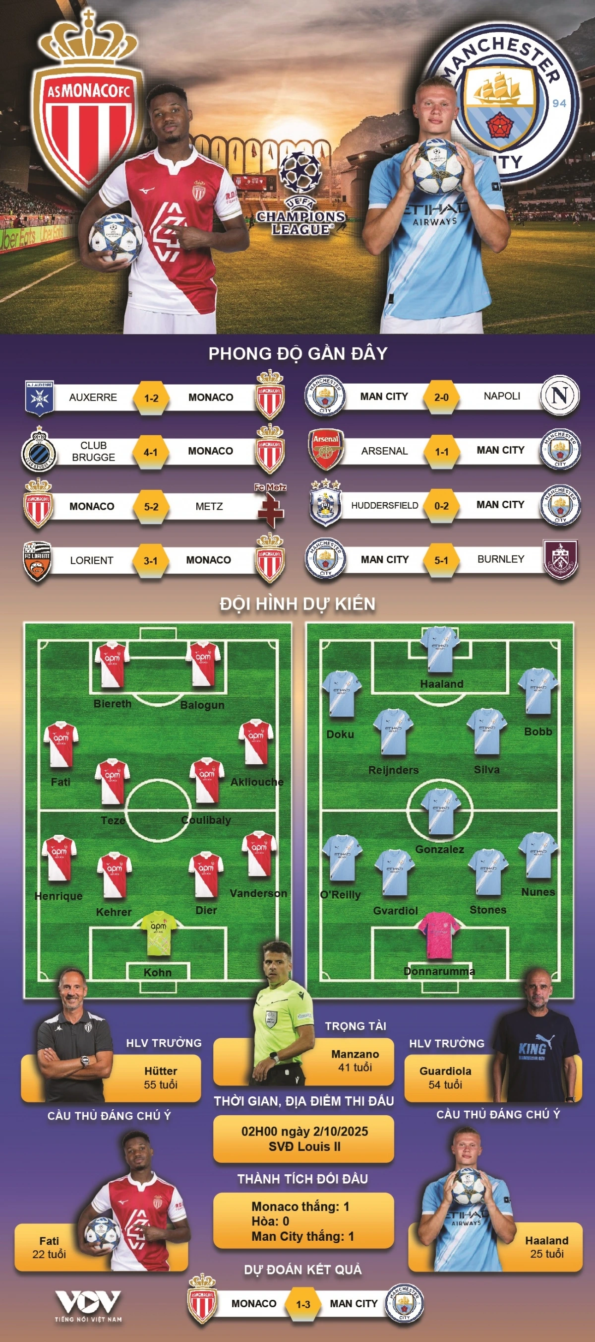 VOV.VN - Dự đoán kết quả và đội hình ra sân trận Monaco vs Man City thuộc khuôn khổ vòng bảng Cúp C1 châu Âu 2025/2026 diễn ra lúc 02h00 ngày 2/10.